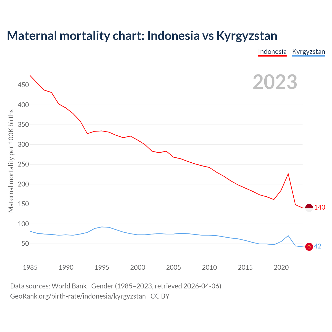 The maternal mortality rate, which is the probability of dying during childbirth or within 42 days of pregnancy termination, is 140 deaths per 100,000 live births in Indonesia, compared to 42 deaths in Kyrgyzstan.