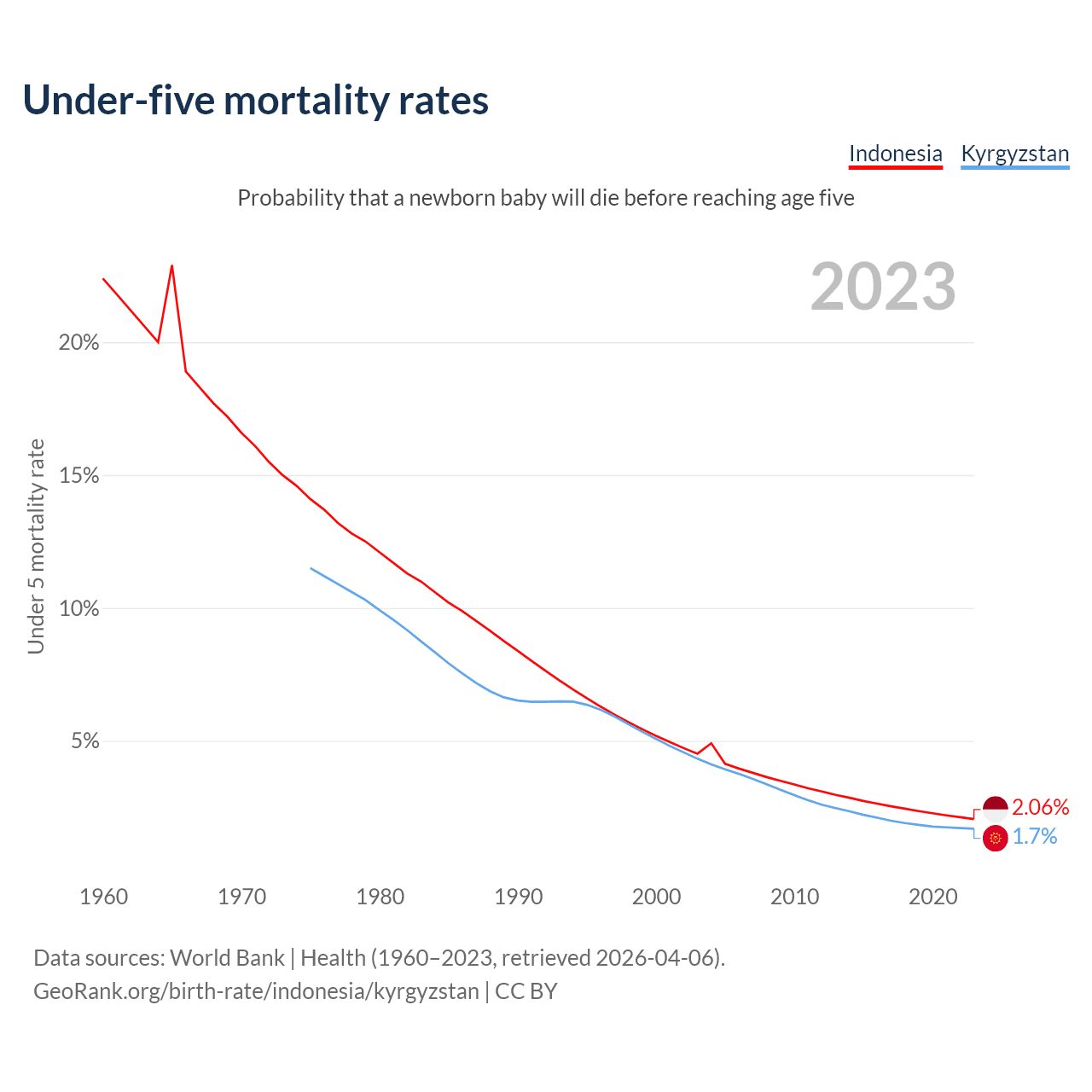 The chance that a newborn baby will die before reaching age five is 2.06% in Indonesia and 1.7% in Kyrgyzstan. Above is a chart with historical data on under-five mortality rates.