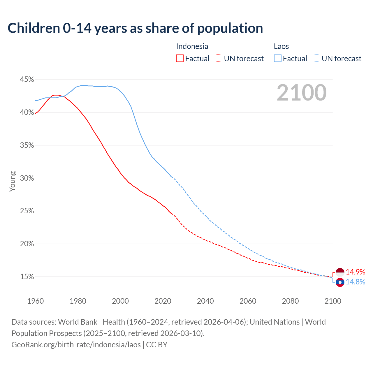 According to the latest available data on birth rates, the fertility rate in Indonesia was 2.13 children per woman in 2023, compared to 2.42 in Laos in 2023. The replacement level is considered to be 2.1 children per woman.