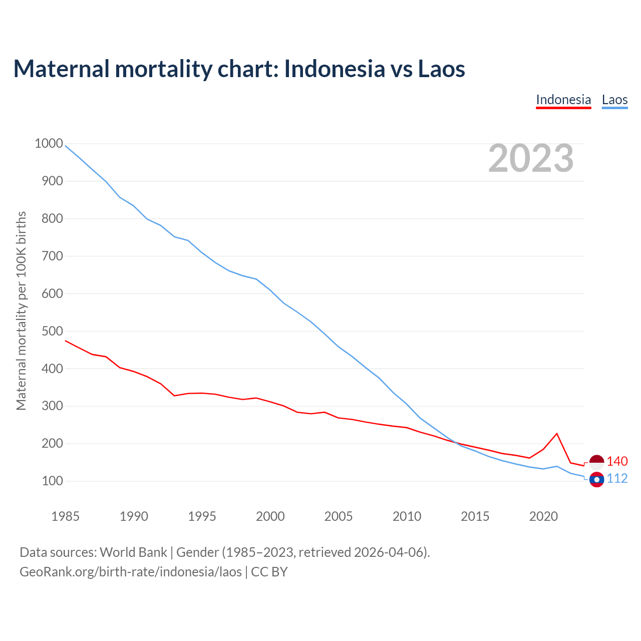 The maternal mortality rate, which is the probability of dying during childbirth or within 42 days of pregnancy termination, is 140 deaths per 100,000 live births in Indonesia, compared to 112 deaths in Laos.