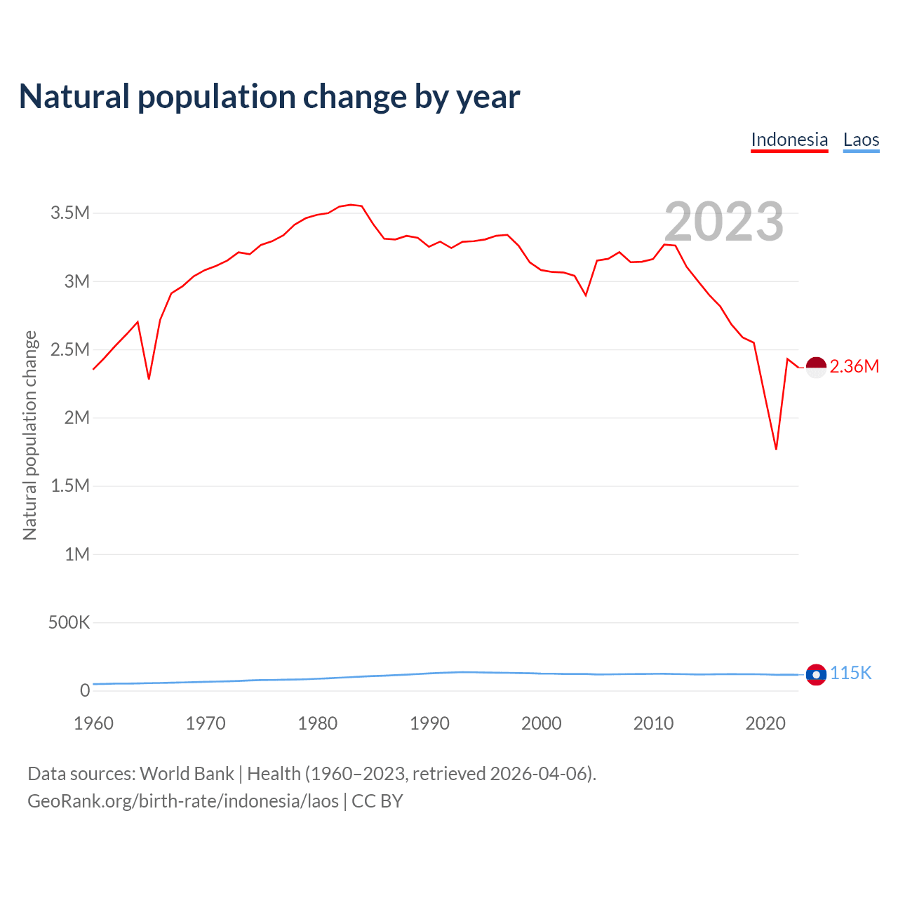 Indonesia has an annual birth rate of 15.9 births per 1,000 people, compared to 21.3 for Laos. The average number of children a woman is expected to have during her lifetime — the fertility rate, is 2.13 in Indonesia and 2.42 in Laos — 13.8% difference.