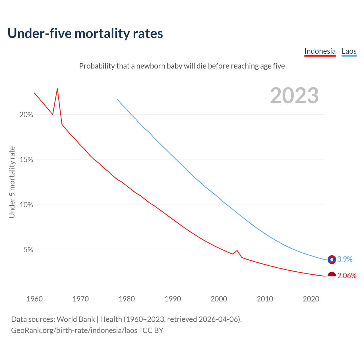 The chance that a newborn baby will die before reaching age five is 2.06% in Indonesia and 3.9% in Laos. Above is a chart with historical data on under-five mortality rates.