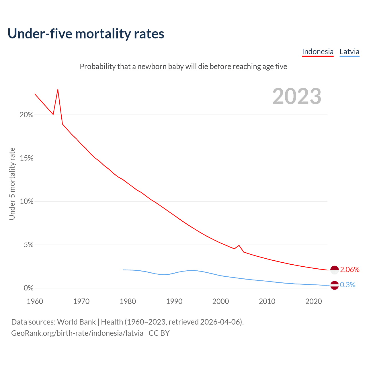 The chance that a newborn baby will die before reaching age five is 2.06% in Indonesia and 0.3% in Latvia. Above is a chart with historical data on under-five mortality rates.