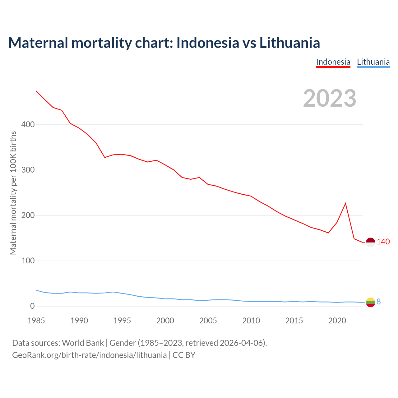 The maternal mortality rate, which is the probability of dying during childbirth or within 42 days of pregnancy termination, is 140 deaths per 100,000 live births in Indonesia, compared to 8 deaths in Lithuania.