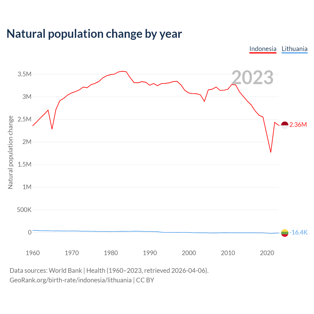 According to the latest available data on birth rates, the fertility rate in Indonesia was 2.13 children per woman in 2023, compared to 1.18 in Lithuania in 2023. The replacement level is considered to be 2.1 children per woman.