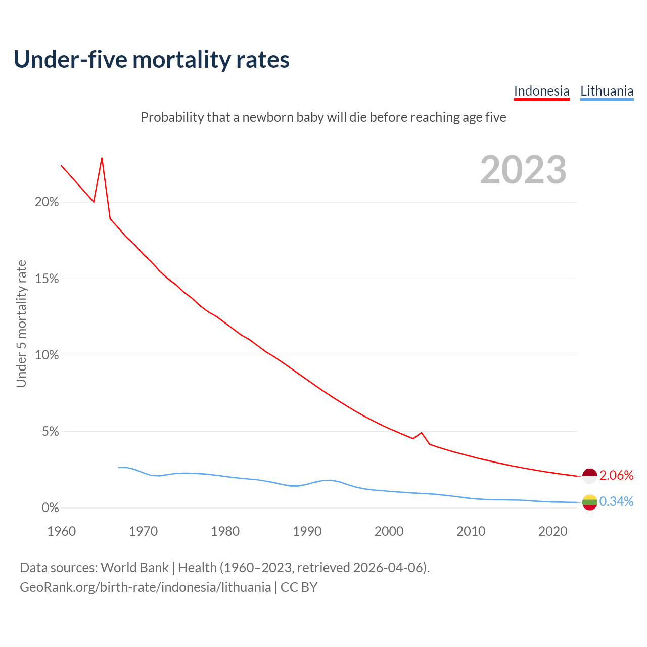 The chance that a newborn baby will die before reaching age five is 2.06% in Indonesia and 0.34% in Lithuania. Above is a chart with historical data on under-five mortality rates.