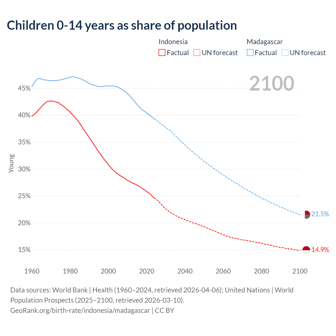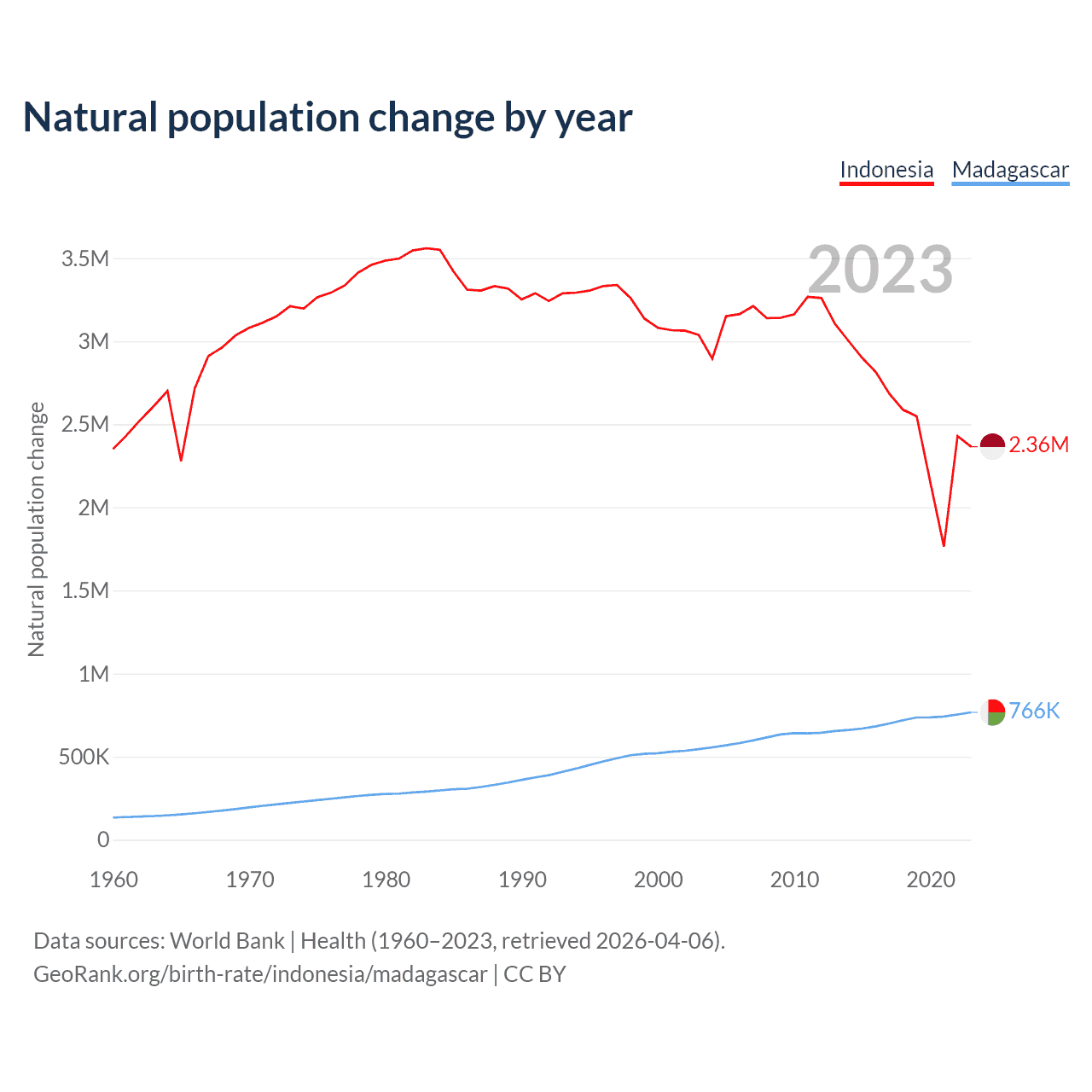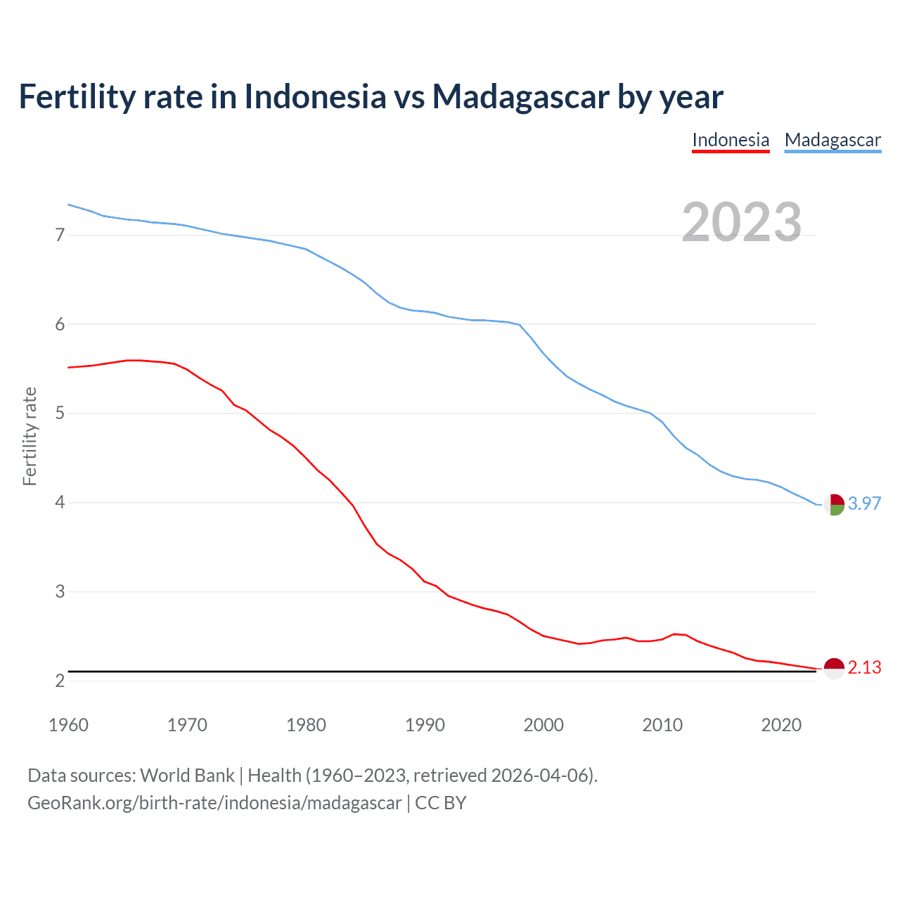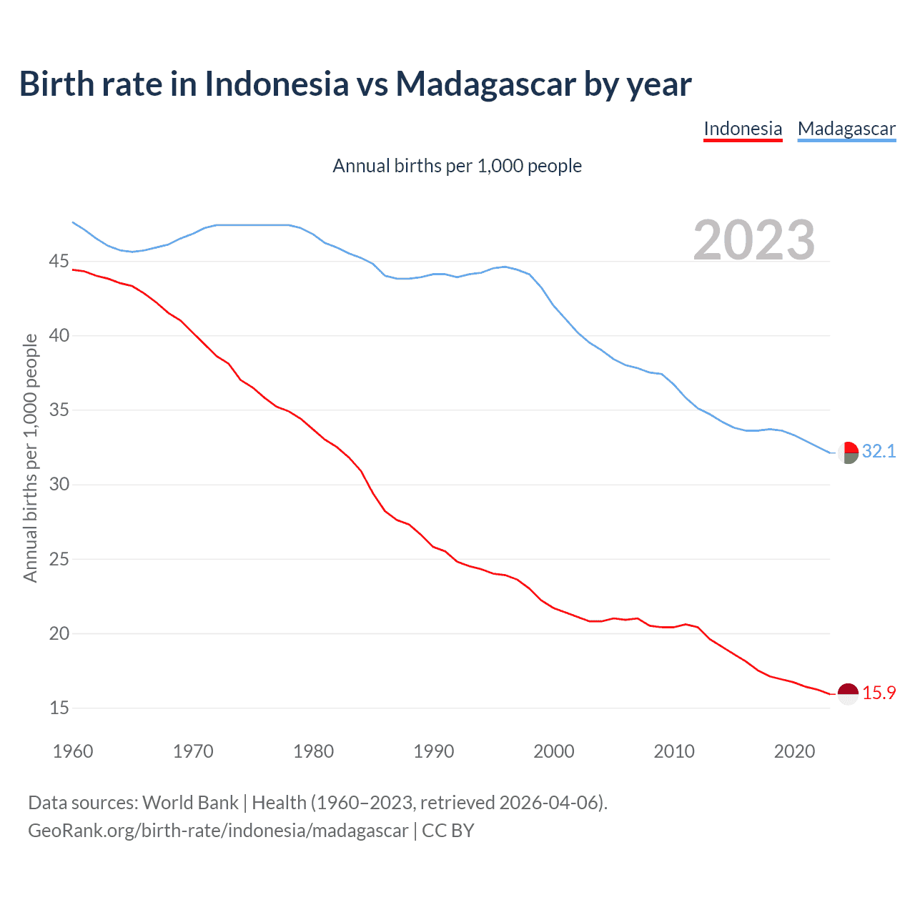 Indonesia has an annual birth rate of 15.9 births per 1,000 people, compared to 32.1 for Madagascar. The average number of children a woman is expected to have during her lifetime — the fertility rate, is 2.13 in Indonesia and 3.97 in Madagascar — 86.7% difference.