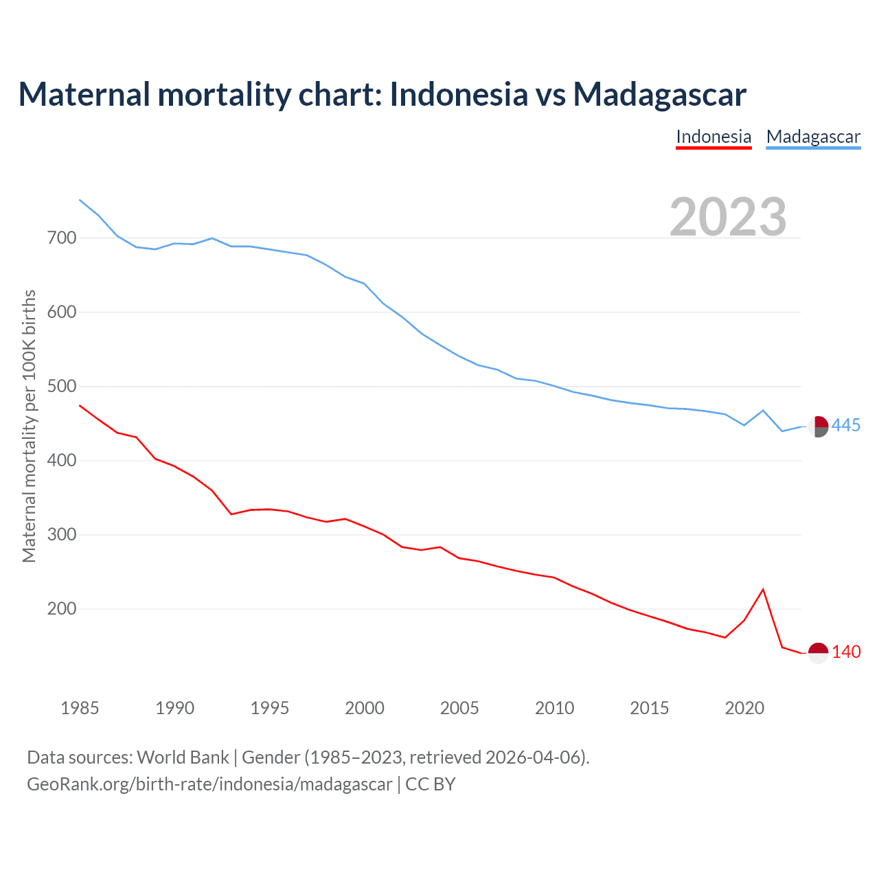 The maternal mortality rate, which is the probability of dying during childbirth or within 42 days of pregnancy termination, is 140 deaths per 100,000 live births in Indonesia, compared to 445 deaths in Madagascar.
