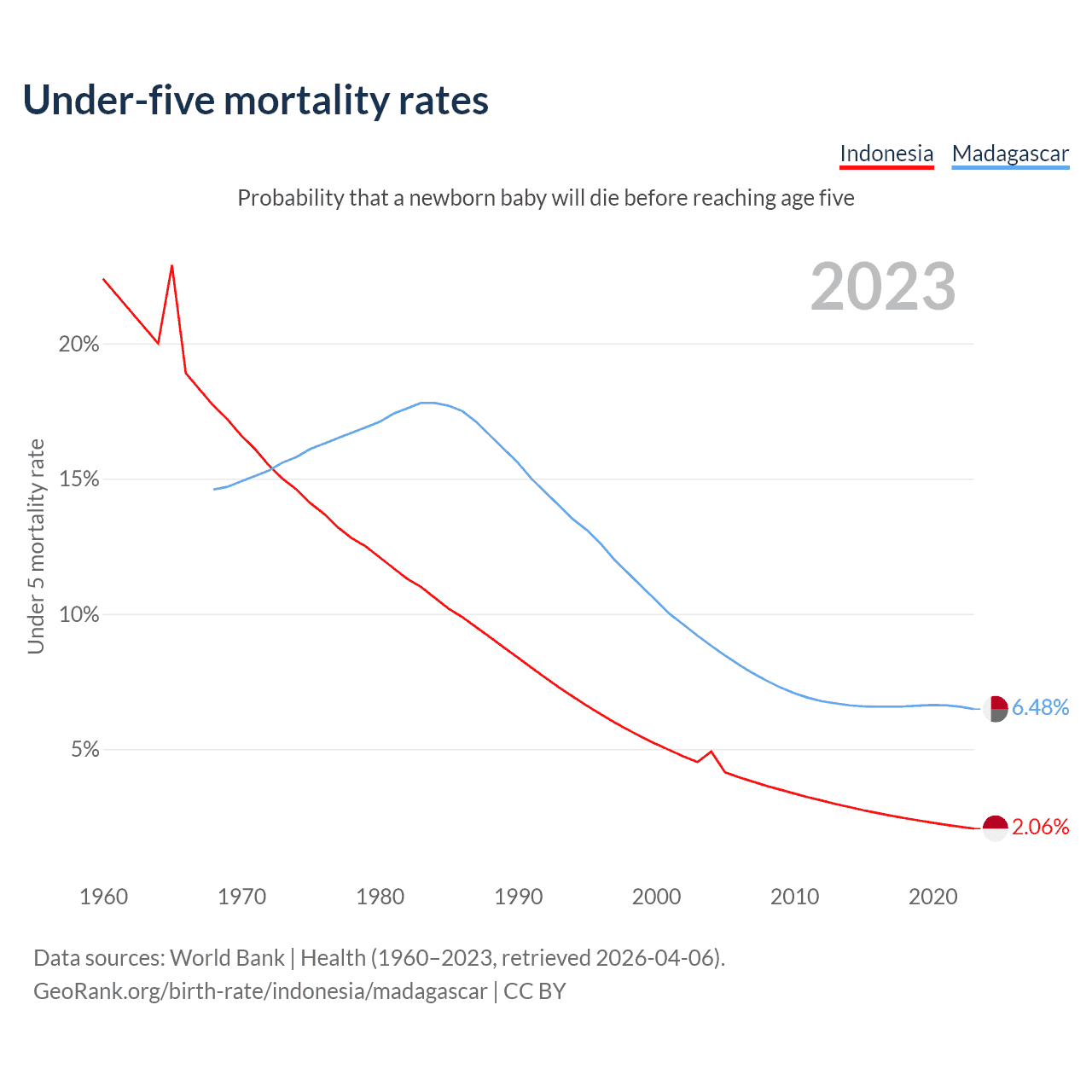 The chance that a newborn baby will die before reaching age five is 2.06% in Indonesia and 6.48% in Madagascar. Above is a chart with historical data on under-five mortality rates.
