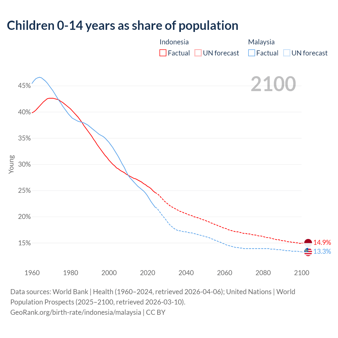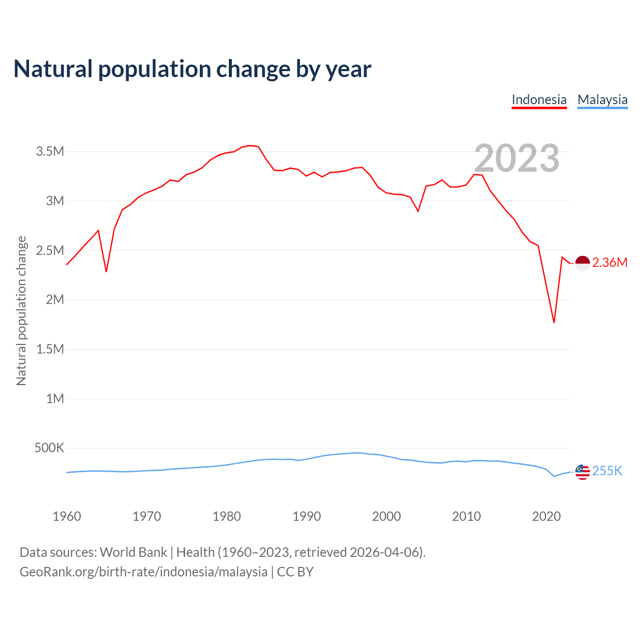 According to the latest available data on birth rates, the fertility rate in Indonesia was 2.13 children per woman in 2023, compared to 1.55 in Malaysia in 2023. The replacement level is considered to be 2.1 children per woman.