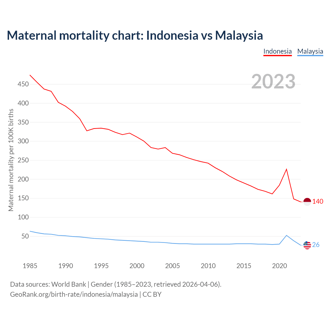 The maternal mortality rate, which is the probability of dying during childbirth or within 42 days of pregnancy termination, is 140 deaths per 100,000 live births in Indonesia, compared to 26 deaths in Malaysia.