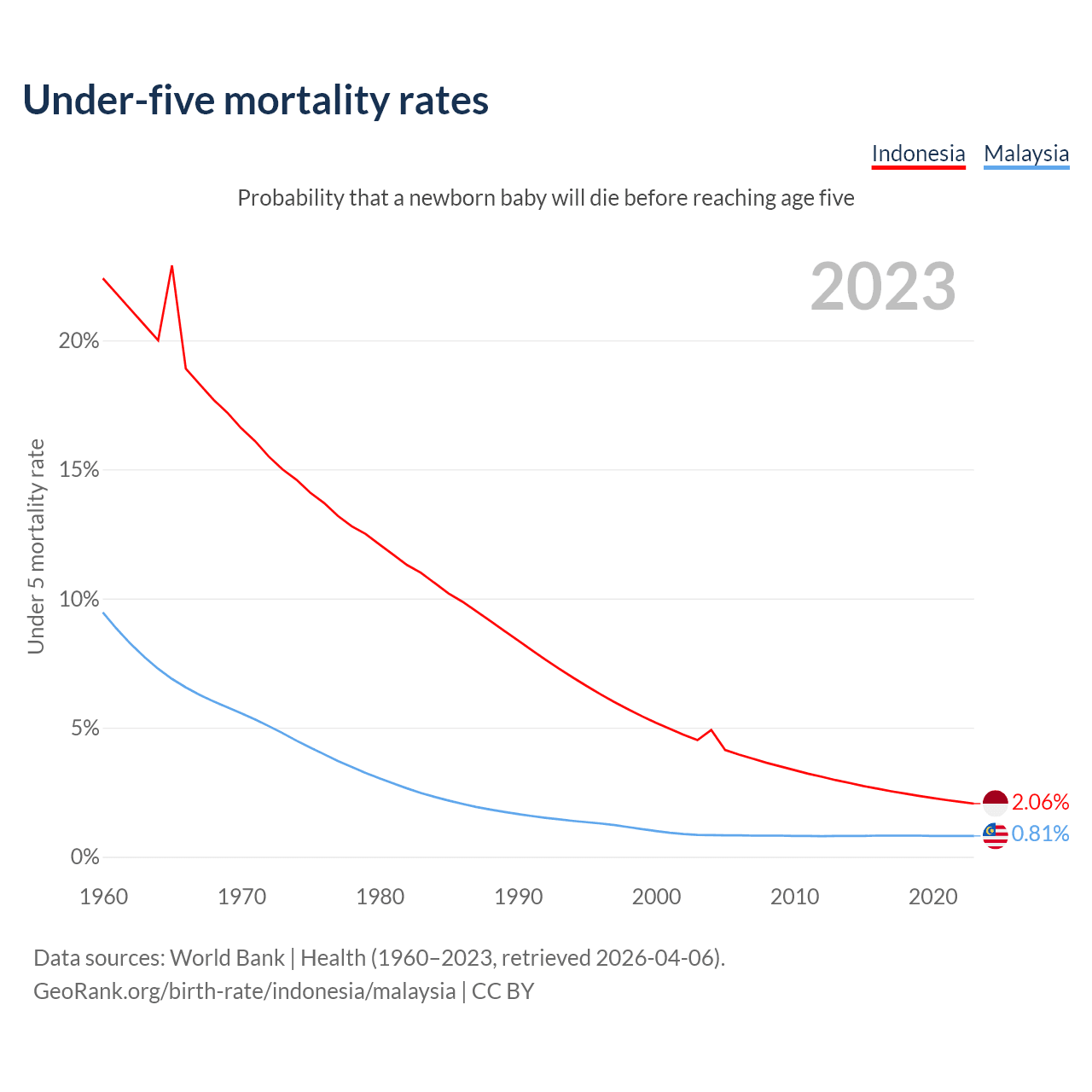The chance that a newborn baby will die before reaching age five is 2.06% in Indonesia and 0.81% in Malaysia. Above is a chart with historical data on under-five mortality rates.