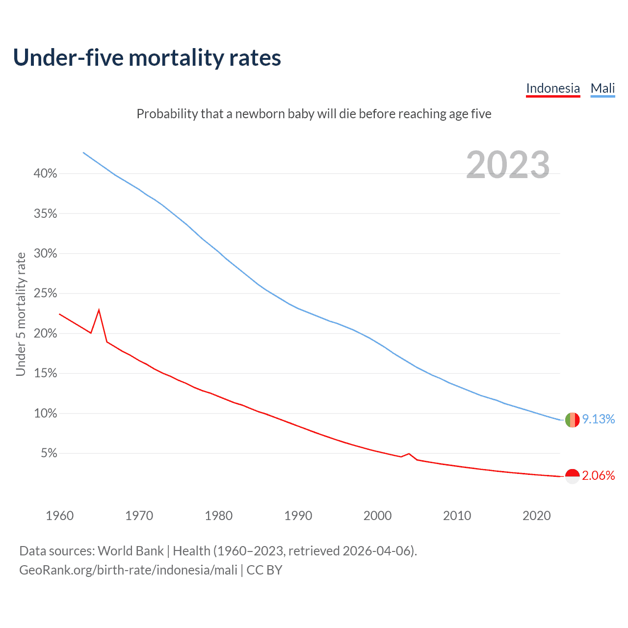 The chance that a newborn baby will die before reaching age five is 2.06% in Indonesia and 9.13% in Mali. Above is a chart with historical data on under-five mortality rates.