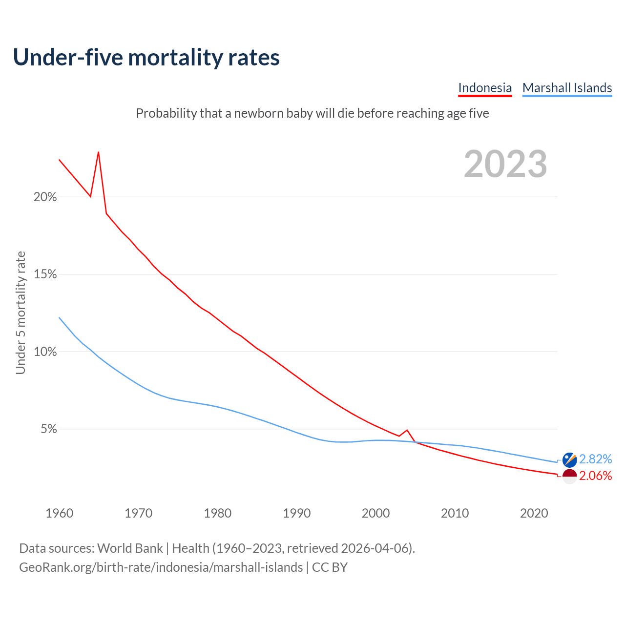 The chance that a newborn baby will die before reaching age five is 2.06% in Indonesia and 2.82% in the Marshall Islands. Above is a chart with historical data on under-five mortality rates.