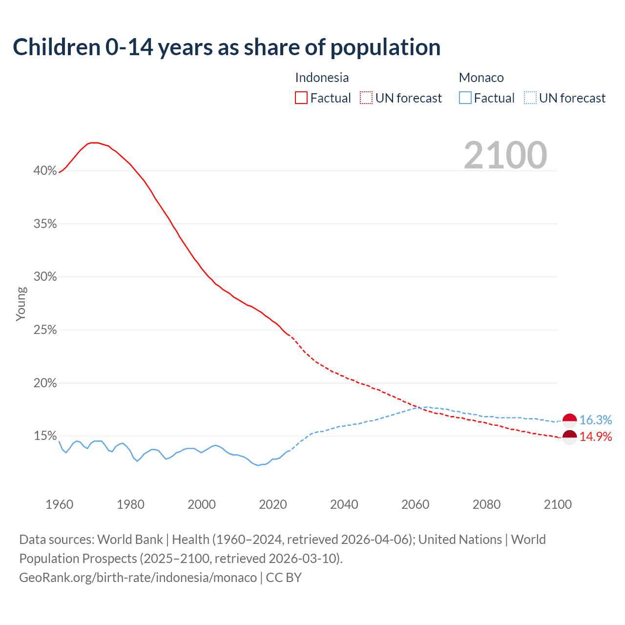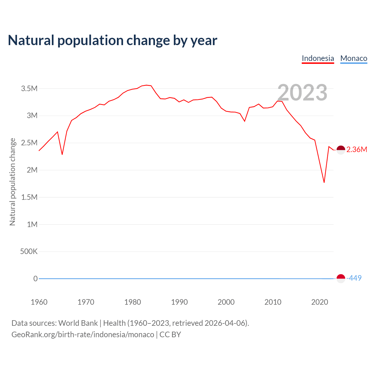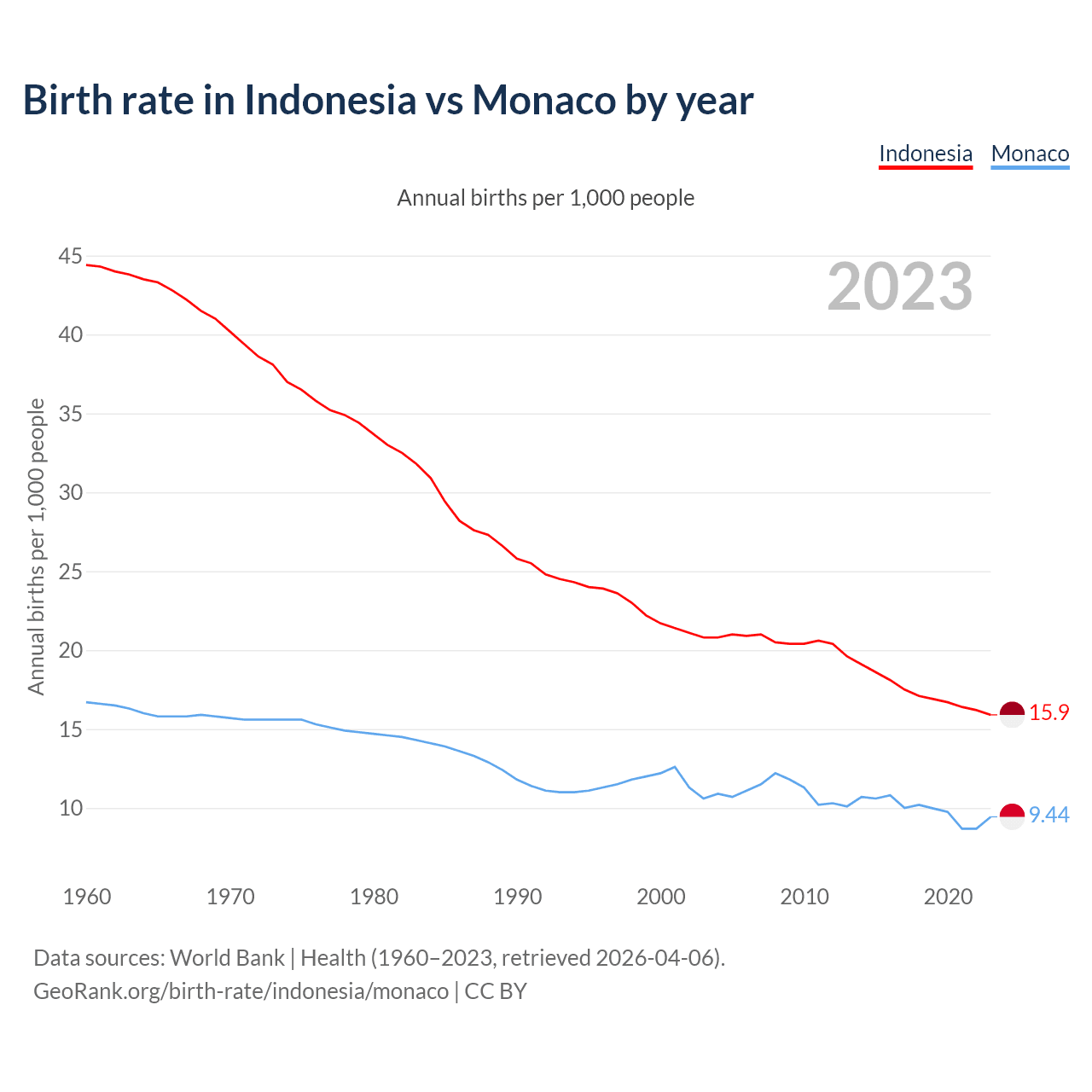 Indonesia has an annual birth rate of 15.9 births per 1,000 people, compared to 9.44 for Monaco. The average number of children a woman is expected to have during her lifetime — the fertility rate, is 2.13 in Indonesia and 2.11 in Monaco — 0.8% difference.