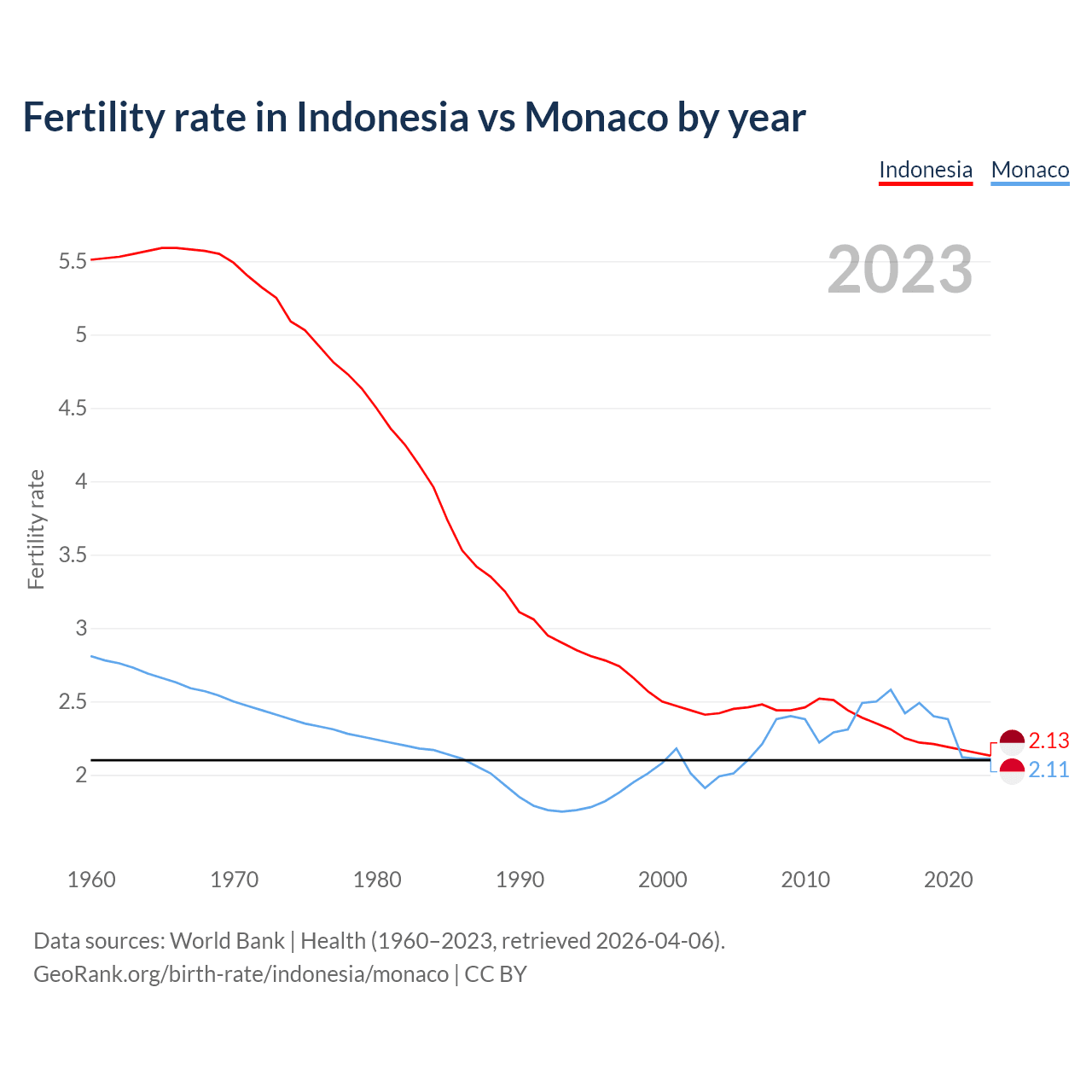 According to the latest available data on birth rates, the fertility rate in Indonesia was 2.13 children per woman in 2023, compared to 2.11 in Monaco in 2023. The replacement level is considered to be 2.1 children per woman.