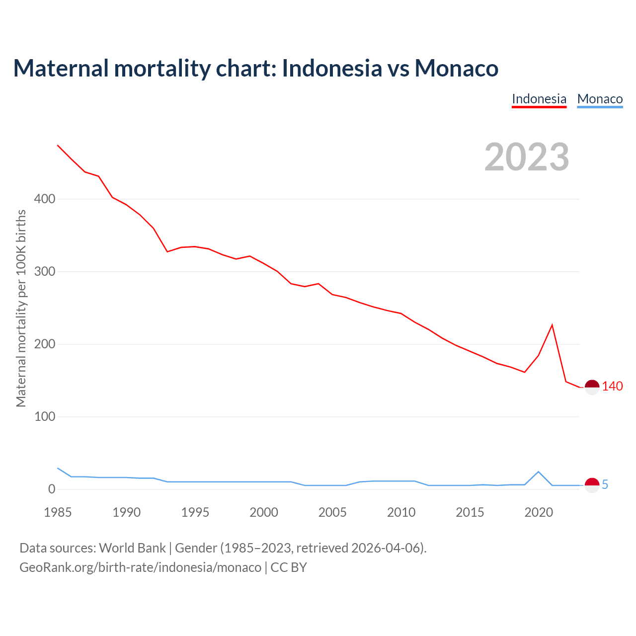 The maternal mortality rate, which is the probability of dying during childbirth or within 42 days of pregnancy termination, is 140 deaths per 100,000 live births in Indonesia, compared to 5 deaths in Monaco.