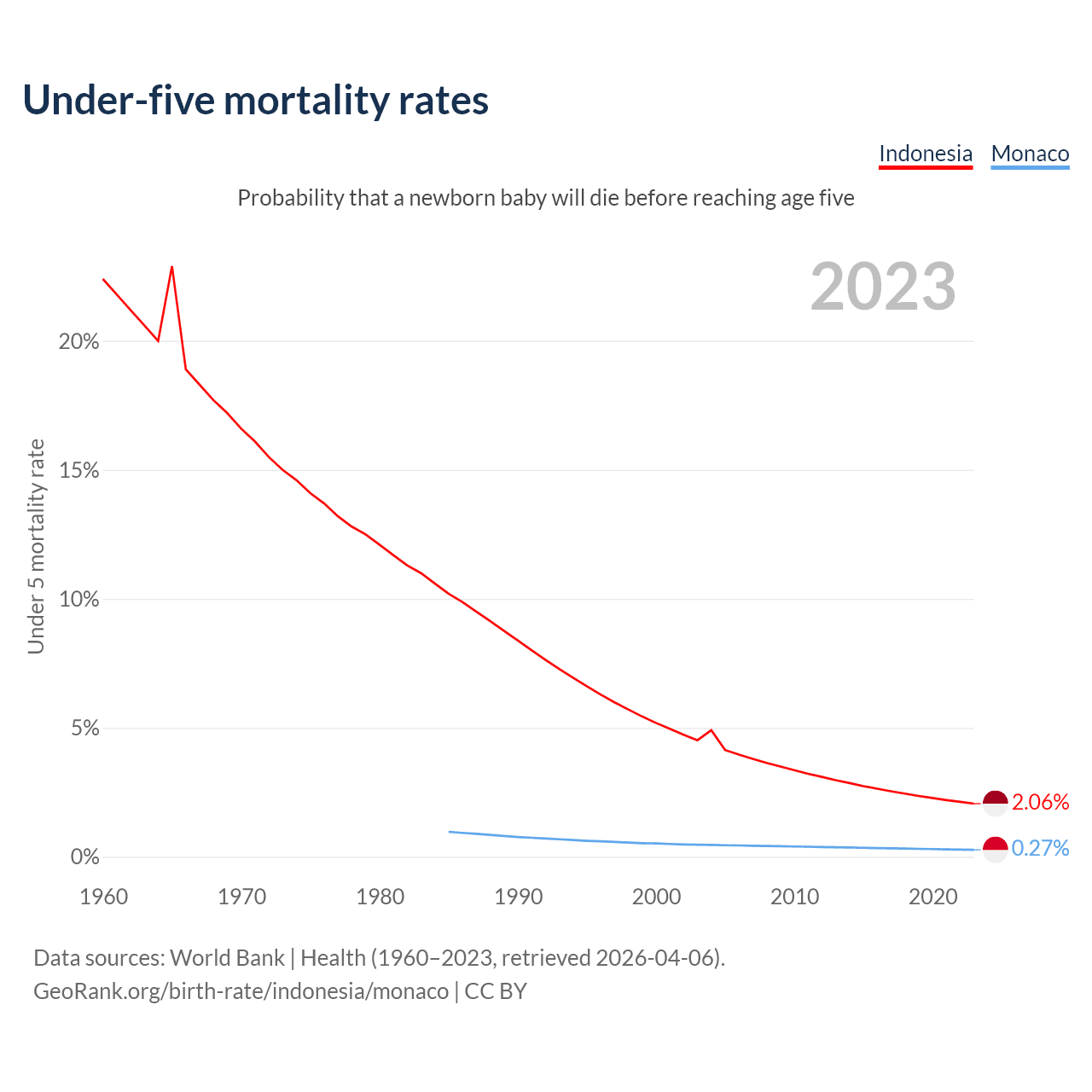The chance that a newborn baby will die before reaching age five is 2.06% in Indonesia and 0.27% in Monaco. Above is a chart with historical data on under-five mortality rates.