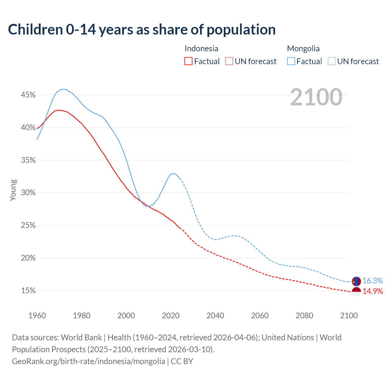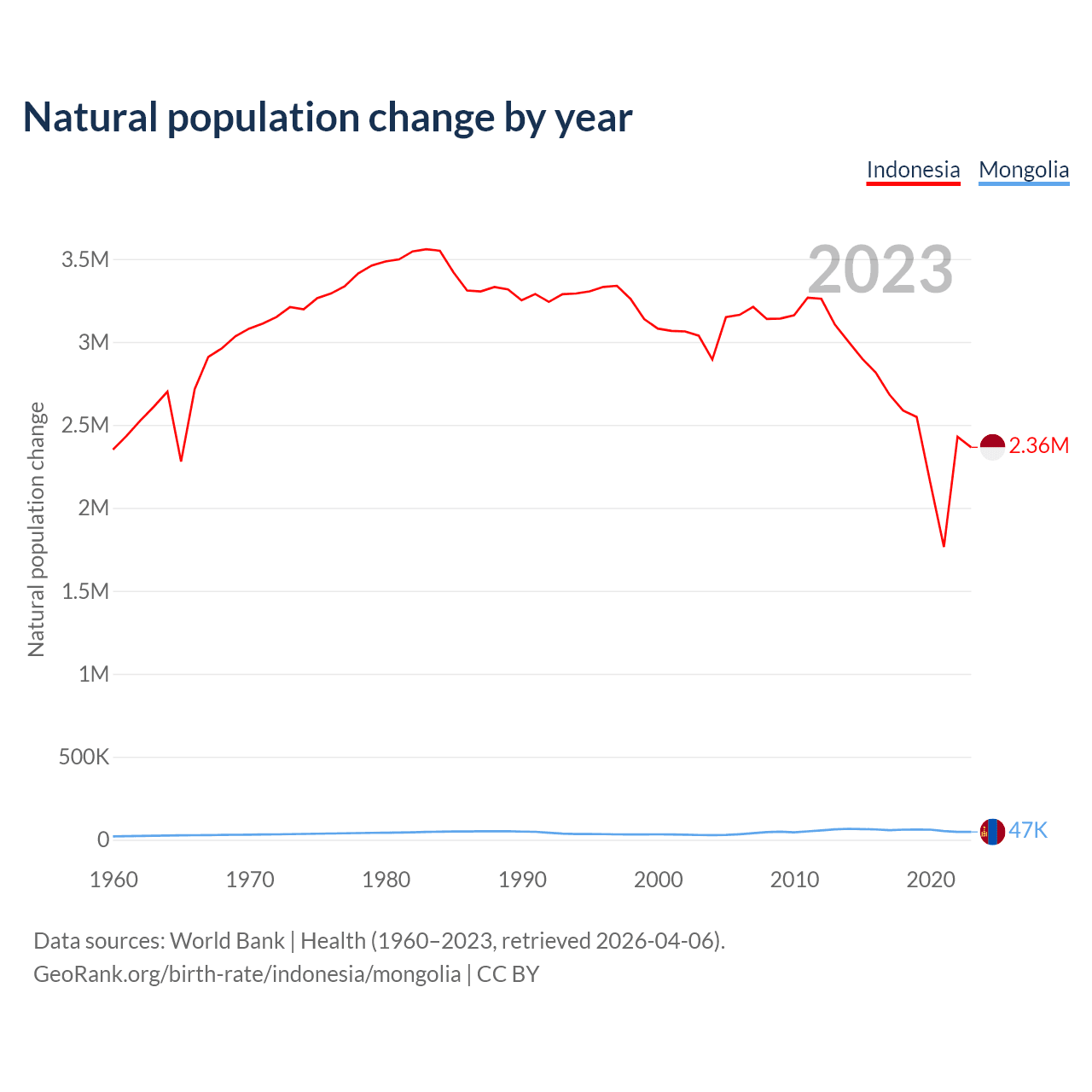 According to the latest available data on birth rates, the fertility rate in Indonesia was 2.13 children per woman in 2023, compared to 2.7 in Mongolia in 2023. The replacement level is considered to be 2.1 children per woman.
