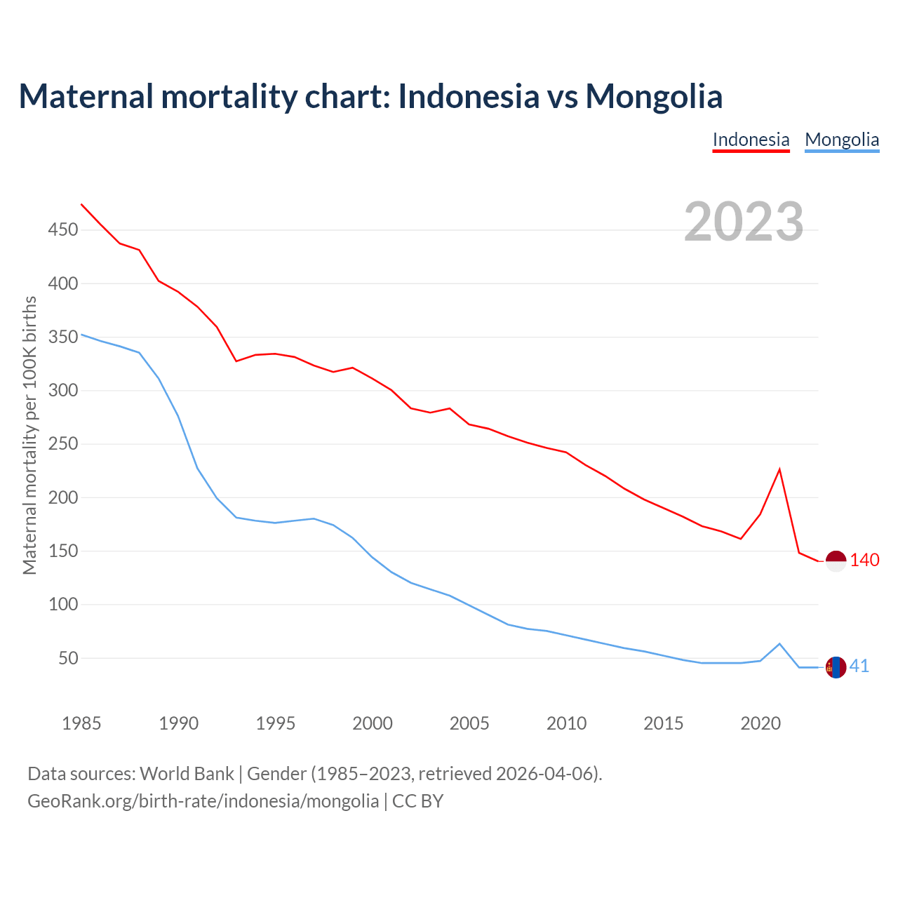 The maternal mortality rate, which is the probability of dying during childbirth or within 42 days of pregnancy termination, is 140 deaths per 100,000 live births in Indonesia, compared to 41 deaths in Mongolia.