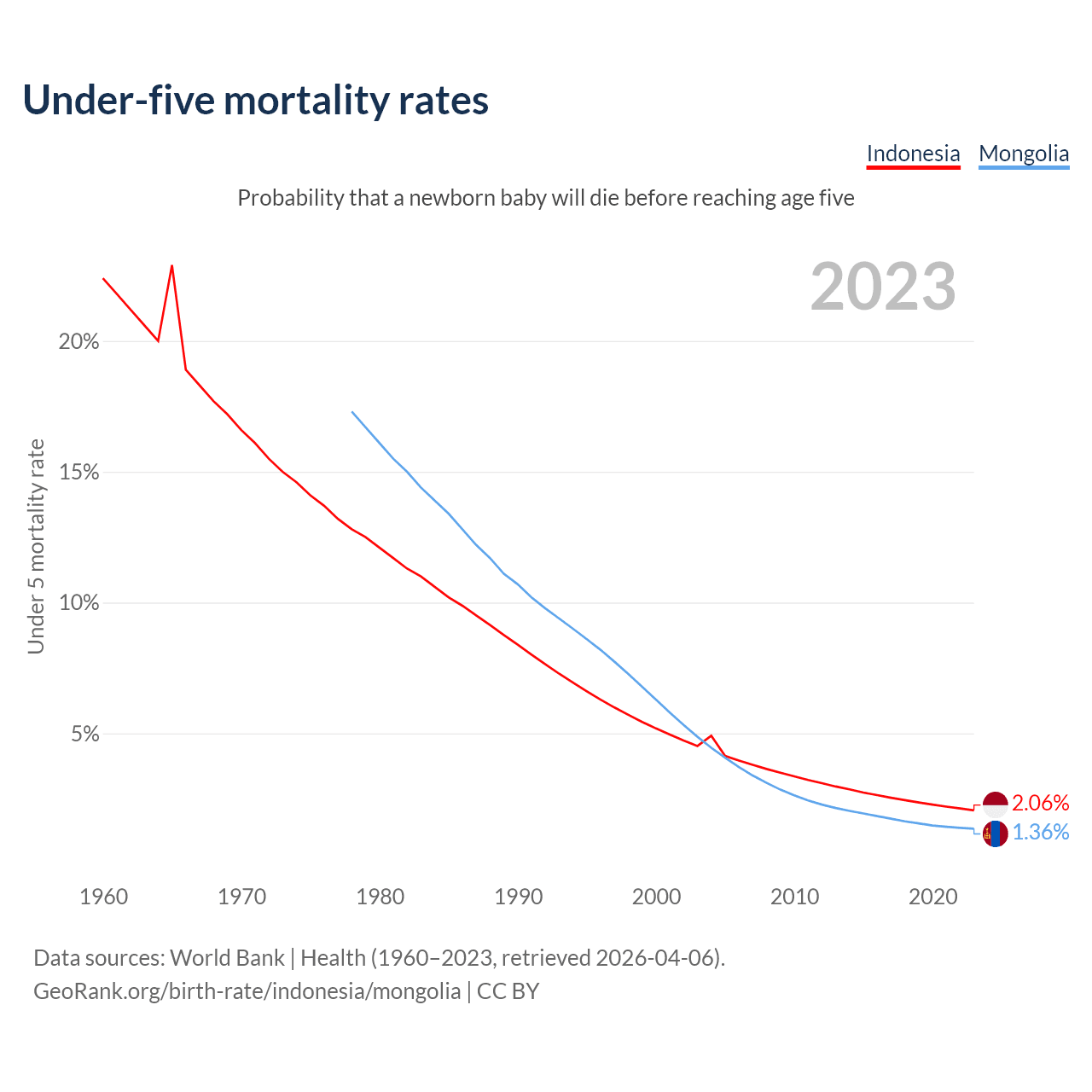 The chance that a newborn baby will die before reaching age five is 2.06% in Indonesia and 1.36% in Mongolia. Above is a chart with historical data on under-five mortality rates.