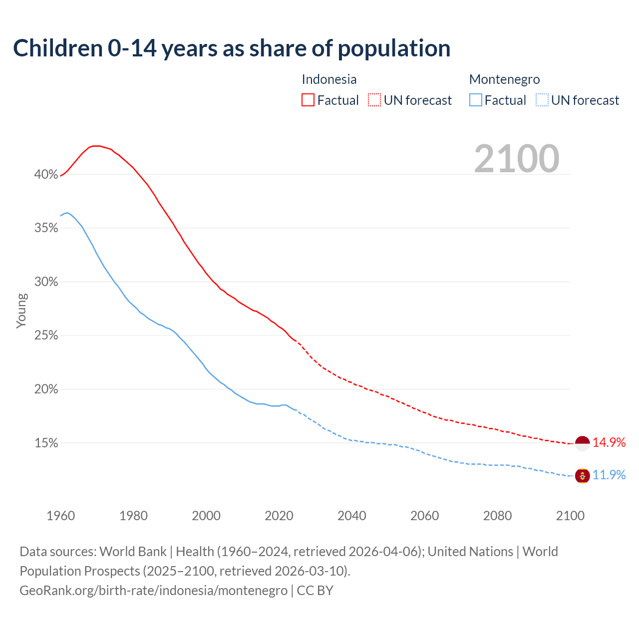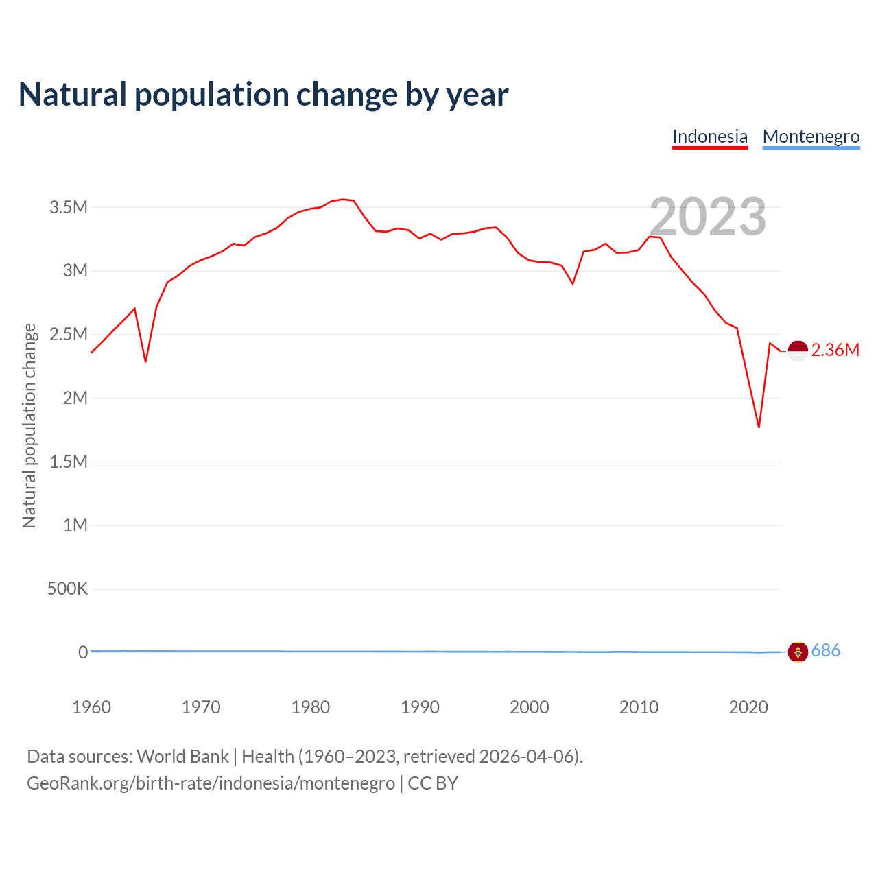 According to the latest available data on birth rates, the fertility rate in Indonesia was 2.13 children per woman in 2023, compared to 1.74 in Montenegro in 2023. The replacement level is considered to be 2.1 children per woman.