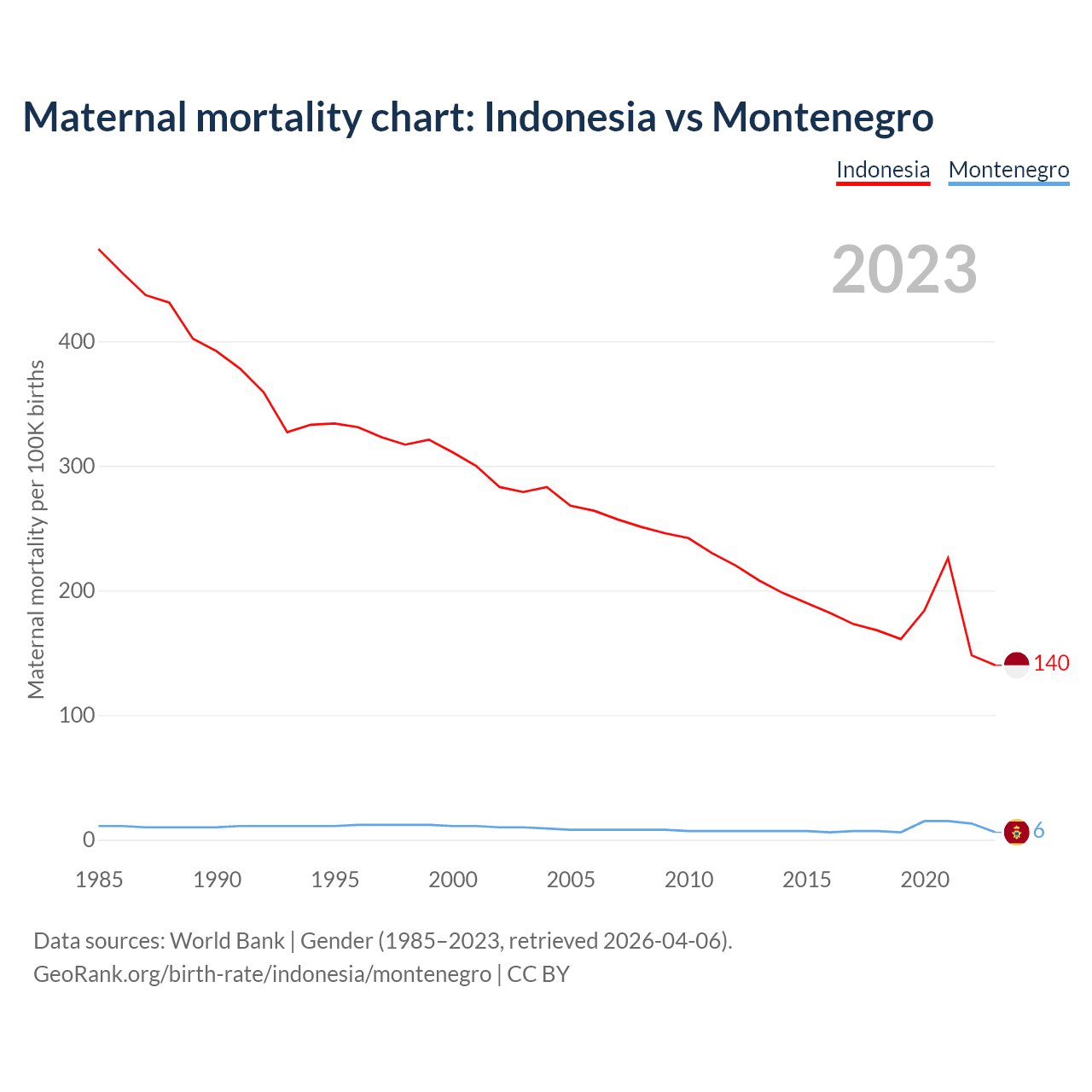 The maternal mortality rate, which is the probability of dying during childbirth or within 42 days of pregnancy termination, is 140 deaths per 100,000 live births in Indonesia, compared to 6 deaths in Montenegro.