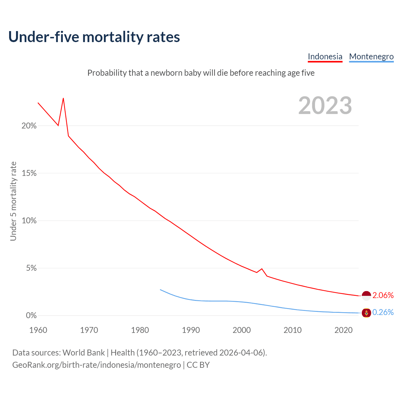 The chance that a newborn baby will die before reaching age five is 2.06% in Indonesia and 0.26% in Montenegro. Above is a chart with historical data on under-five mortality rates.
