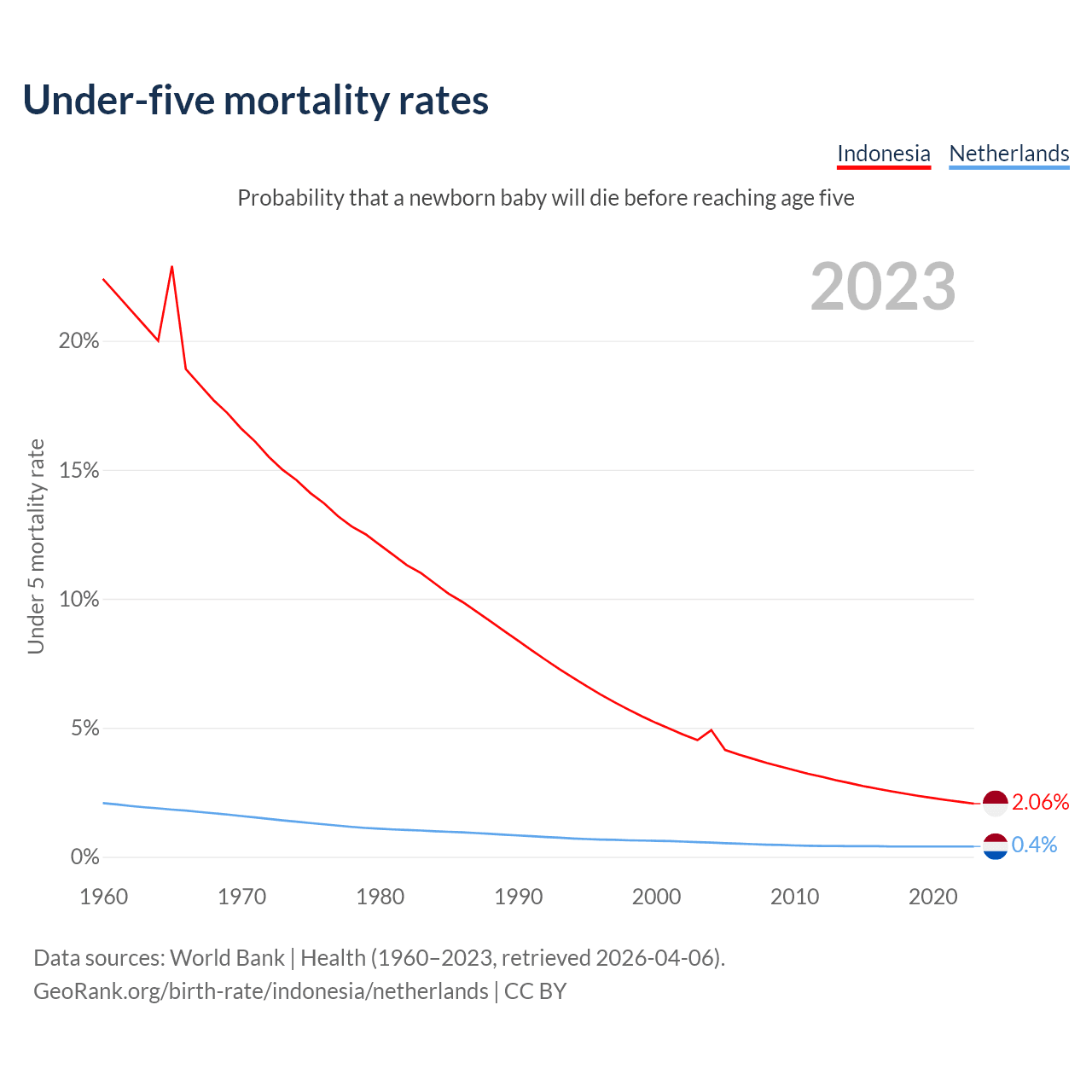 The chance that a newborn baby will die before reaching age five is 2.06% in Indonesia and 0.4% in the Netherlands. Above is a chart with historical data on under-five mortality rates.