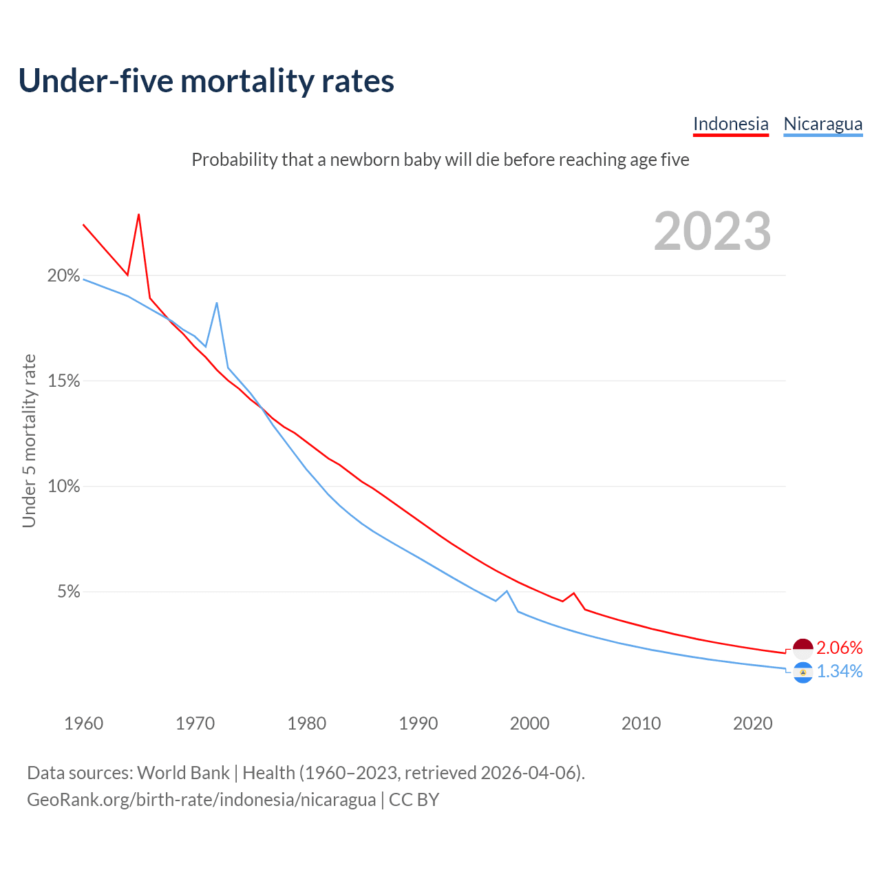 The chance that a newborn baby will die before reaching age five is 2.06% in Indonesia and 1.34% in Nicaragua. Above is a chart with historical data on under-five mortality rates.