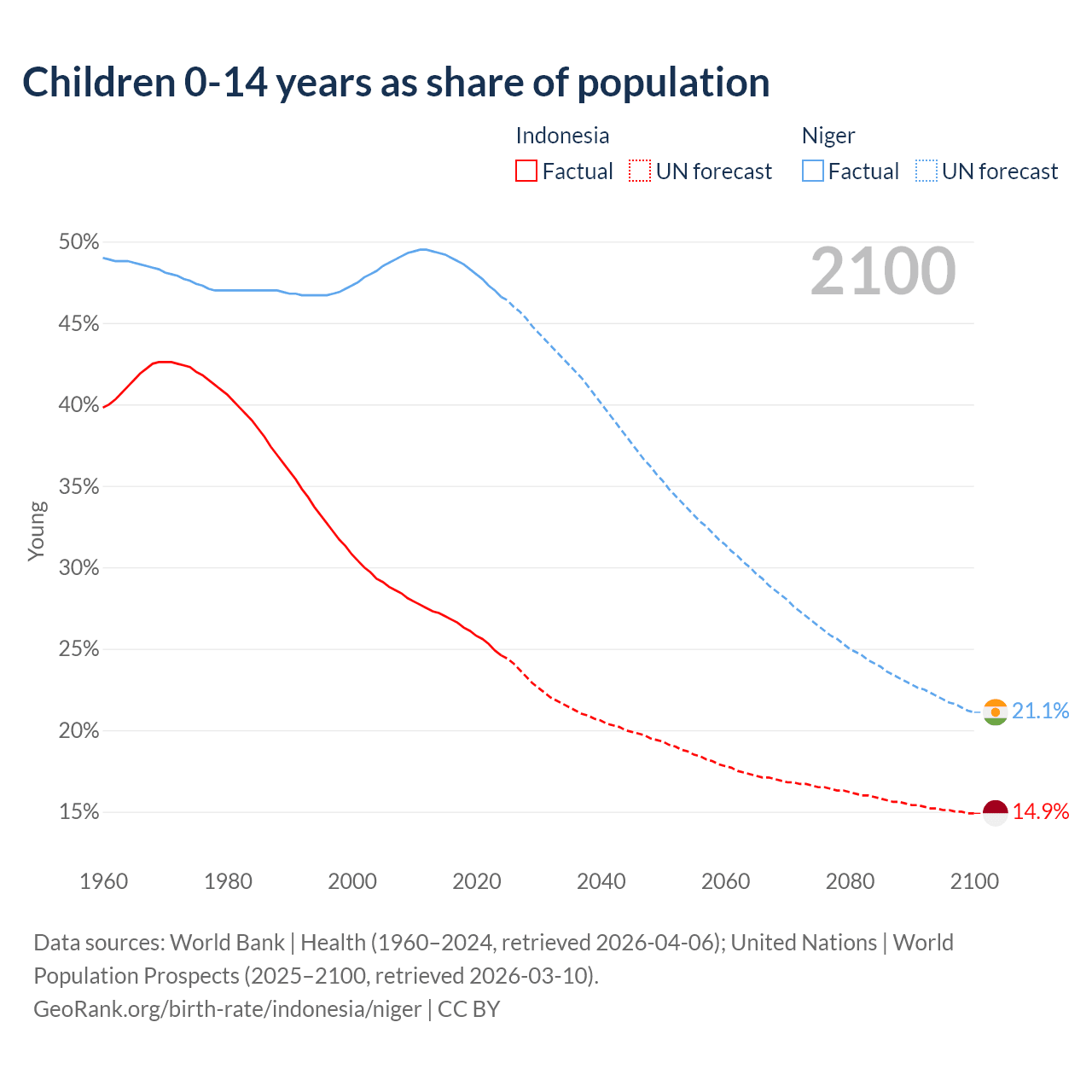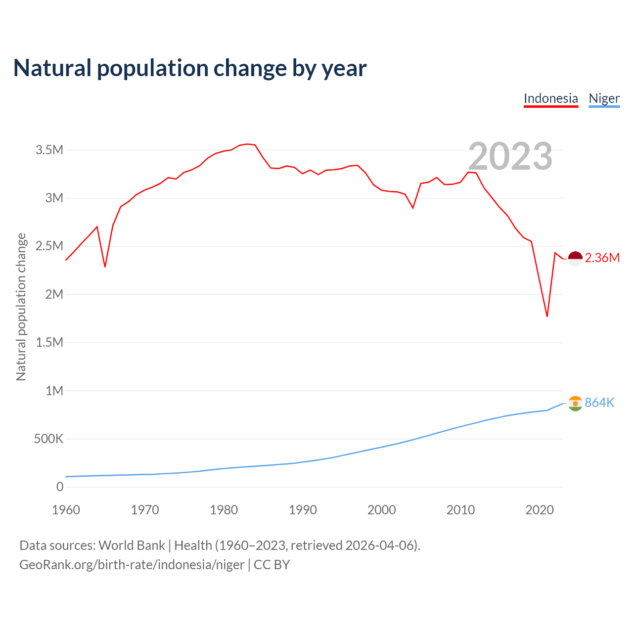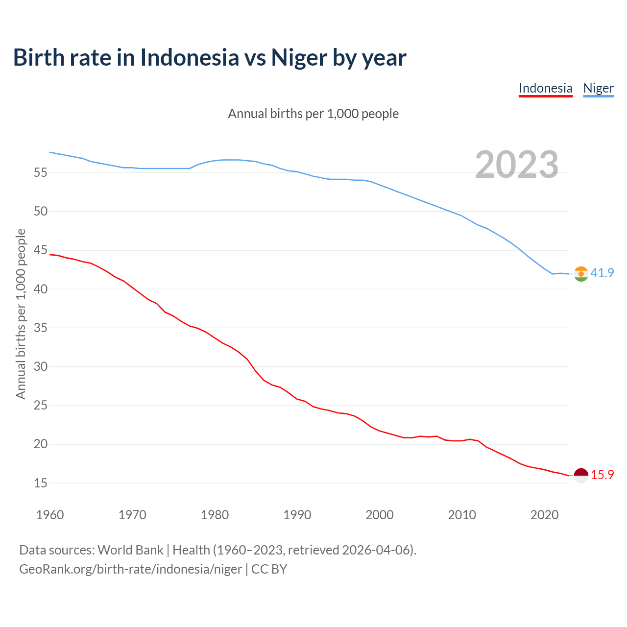 Indonesia has an annual birth rate of 15.9 births per 1,000 people, compared to 41.9 for Niger. The average number of children a woman is expected to have during her lifetime — the fertility rate, is 2.13 in Indonesia and 6.06 in Niger — 185% difference.