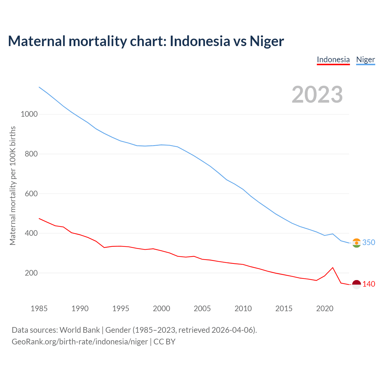 The maternal mortality rate, which is the probability of dying during childbirth or within 42 days of pregnancy termination, is 140 deaths per 100,000 live births in Indonesia, compared to 350 deaths in Niger.