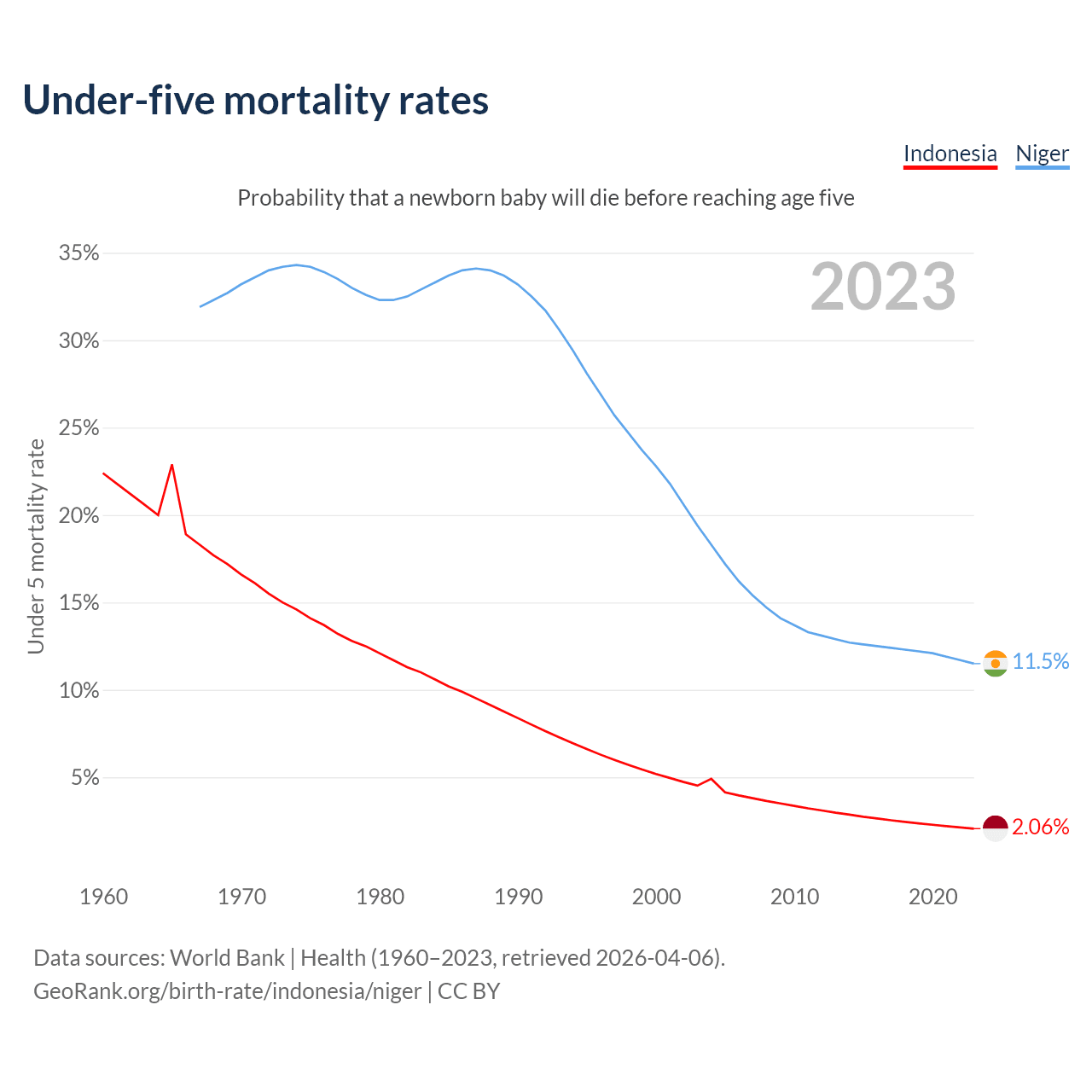 The chance that a newborn baby will die before reaching age five is 2.06% in Indonesia and 11.5% in Niger. Above is a chart with historical data on under-five mortality rates.