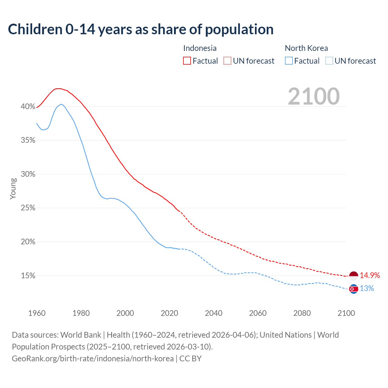 According to the latest available data on birth rates, the fertility rate in Indonesia was 2.13 children per woman in 2023, compared to 1.78 in North Korea in 2023. The replacement level is considered to be 2.1 children per woman.