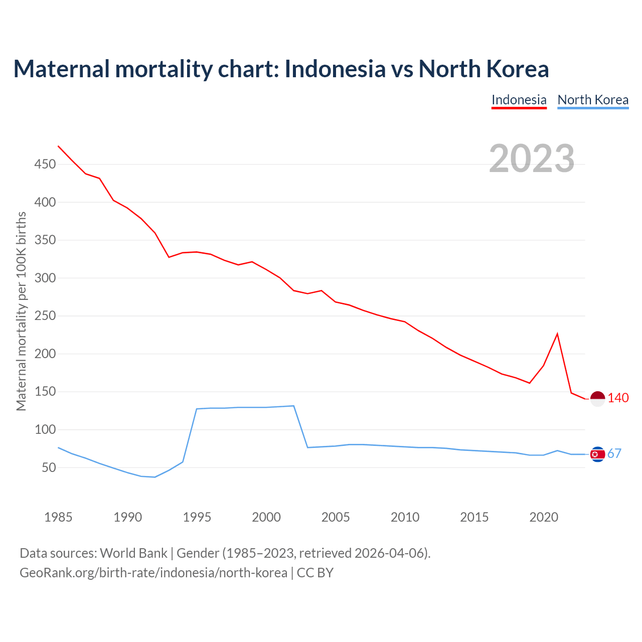 The maternal mortality rate, which is the probability of dying during childbirth or within 42 days of pregnancy termination, is 140 deaths per 100,000 live births in Indonesia, compared to 67 deaths in North Korea.