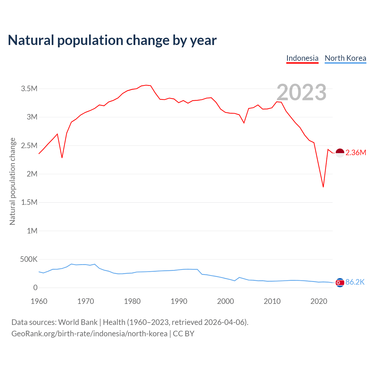 Indonesia has an annual birth rate of 15.9 births per 1,000 people, compared to 12.9 for North Korea. The average number of children a woman is expected to have during her lifetime — the fertility rate, is 2.13 in Indonesia and 1.78 in North Korea — 16.3% difference.