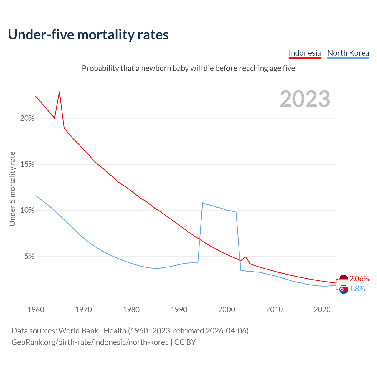 The chance that a newborn baby will die before reaching age five is 2.06% in Indonesia and 1.8% in North Korea. Above is a chart with historical data on under-five mortality rates.