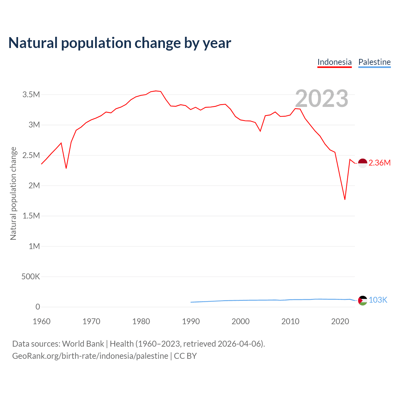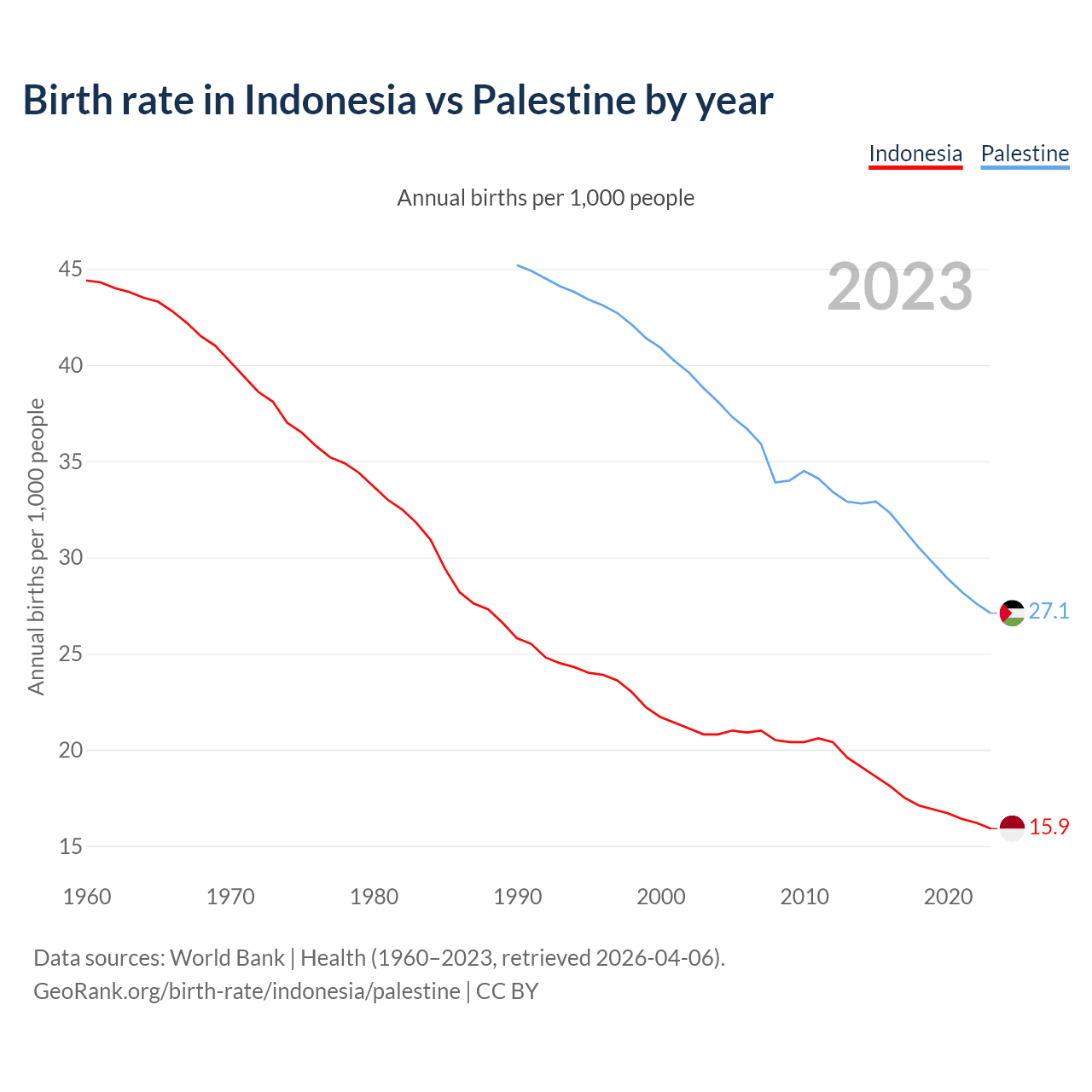 Indonesia has an annual birth rate of 15.9 births per 1,000 people, compared to 27.1 for Palestine. The average number of children a woman is expected to have during her lifetime — the fertility rate, is 2.13 in Indonesia and 3.31 in Palestine — 55.7% difference.