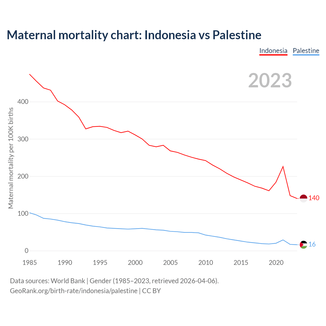 The maternal mortality rate, which is the probability of dying during childbirth or within 42 days of pregnancy termination, is 140 deaths per 100,000 live births in Indonesia, compared to 16 deaths in Palestine.