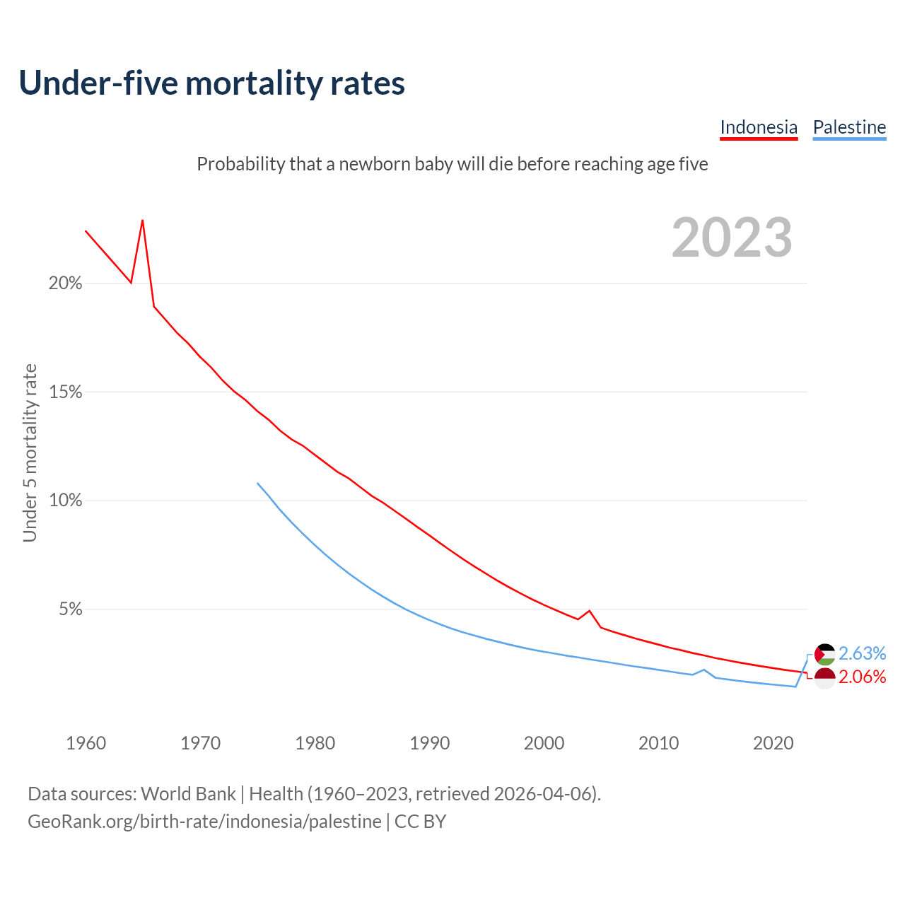 The chance that a newborn baby will die before reaching age five is 2.06% in Indonesia and 2.63% in Palestine. Above is a chart with historical data on under-five mortality rates.