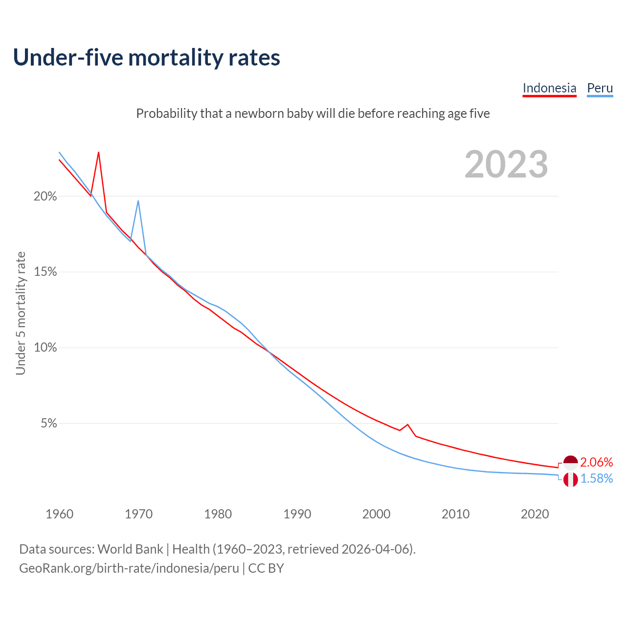 The chance that a newborn baby will die before reaching age five is 2.06% in Indonesia and 1.58% in Peru. Above is a chart with historical data on under-five mortality rates.