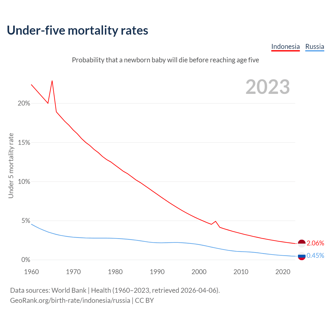 The chance that a newborn baby will die before reaching age five is 2.06% in Indonesia and 0.45% in Russia. Above is a chart with historical data on under-five mortality rates.