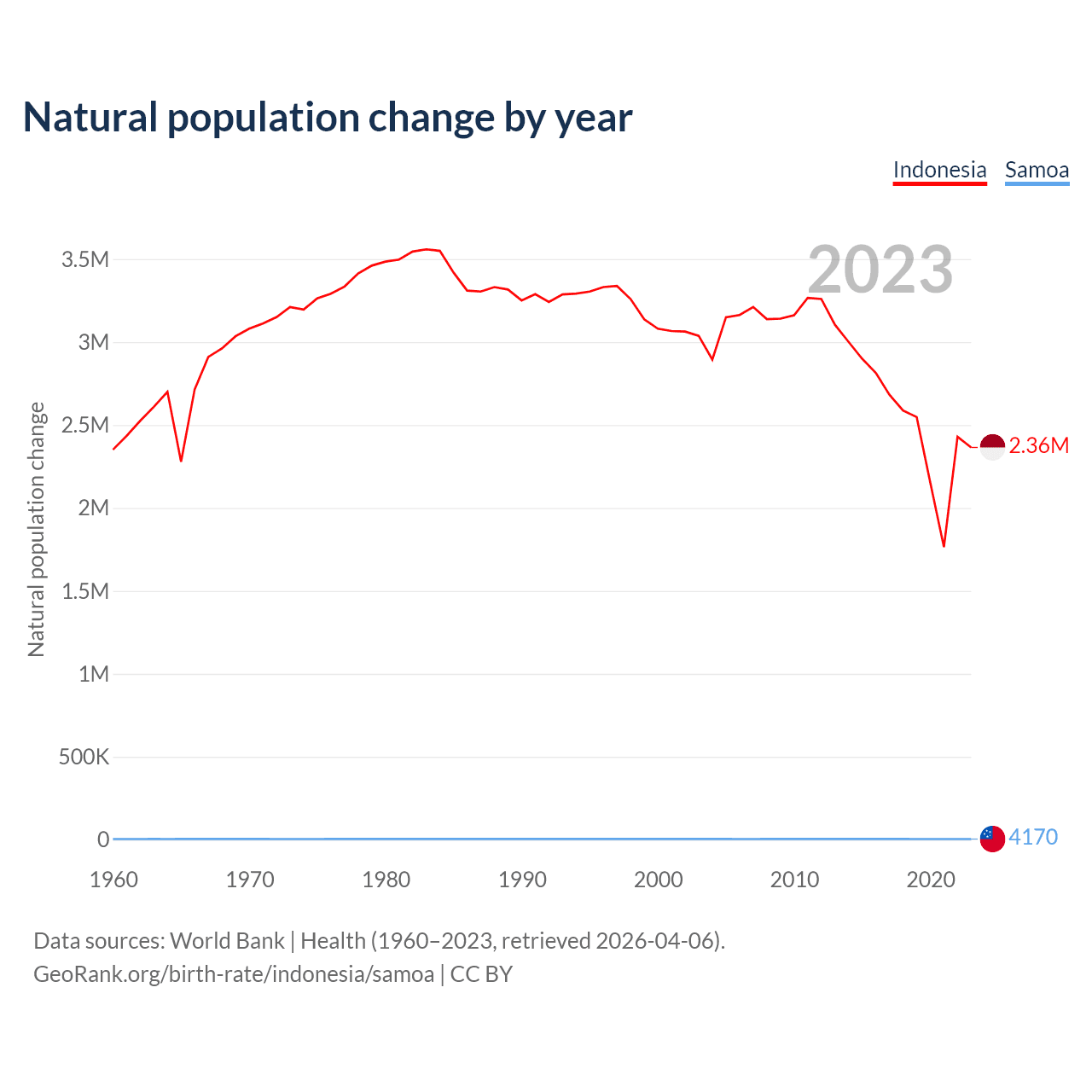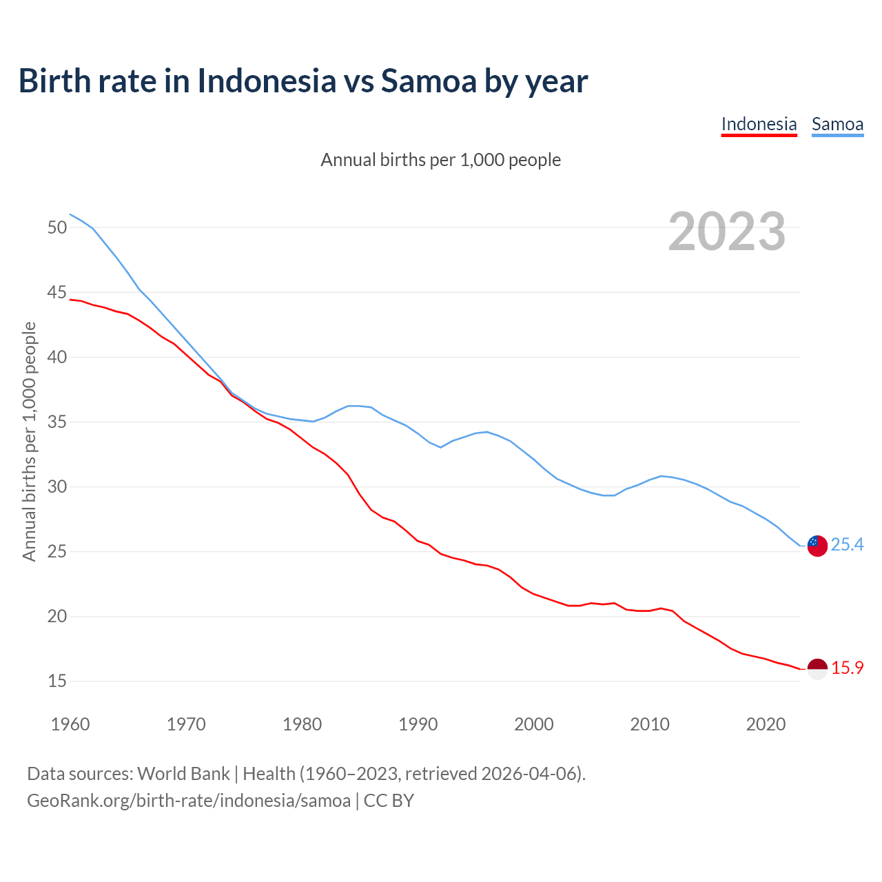 Indonesia has an annual birth rate of 15.9 births per 1,000 people, compared to 25.4 for Samoa. The average number of children a woman is expected to have during her lifetime — the fertility rate, is 2.13 in Indonesia and 3.83 in Samoa — 80% difference.