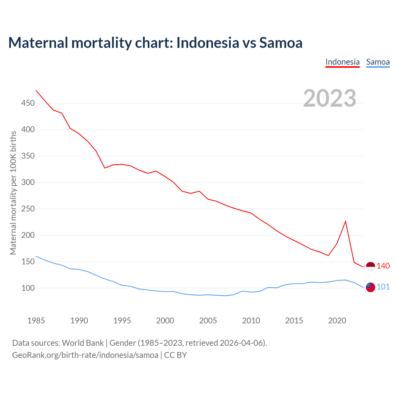 The maternal mortality rate, which is the probability of dying during childbirth or within 42 days of pregnancy termination, is 140 deaths per 100,000 live births in Indonesia, compared to 101 deaths in Samoa.
