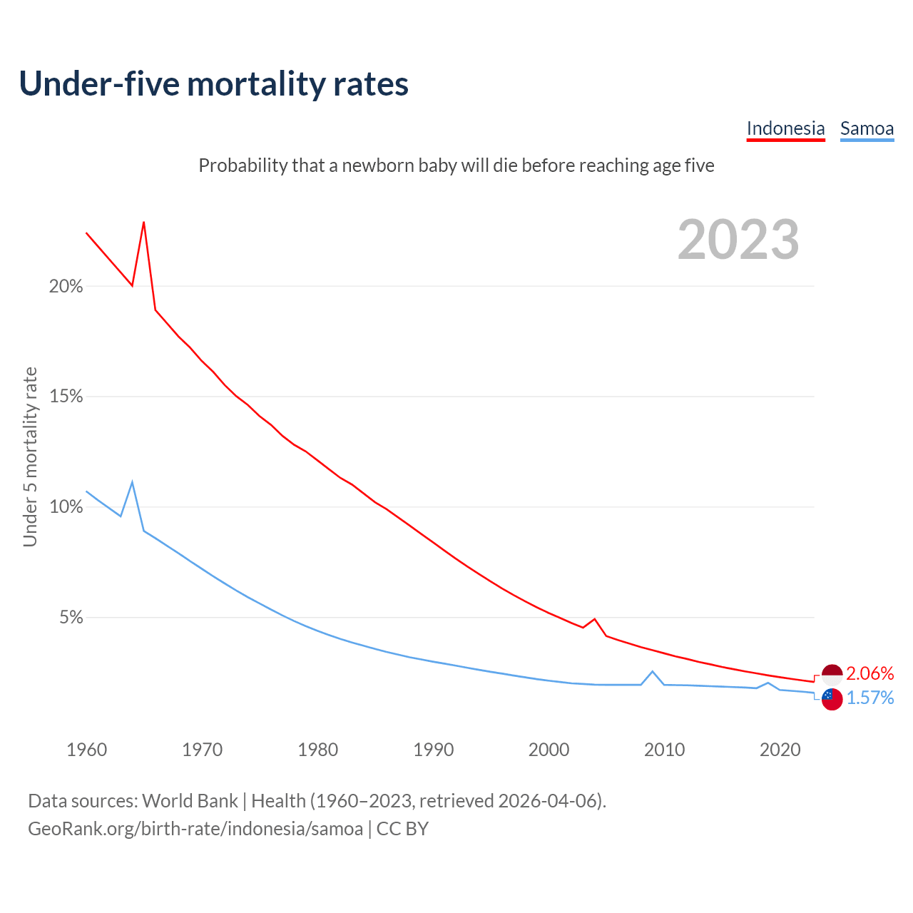 The chance that a newborn baby will die before reaching age five is 2.06% in Indonesia and 1.57% in Samoa. Above is a chart with historical data on under-five mortality rates.