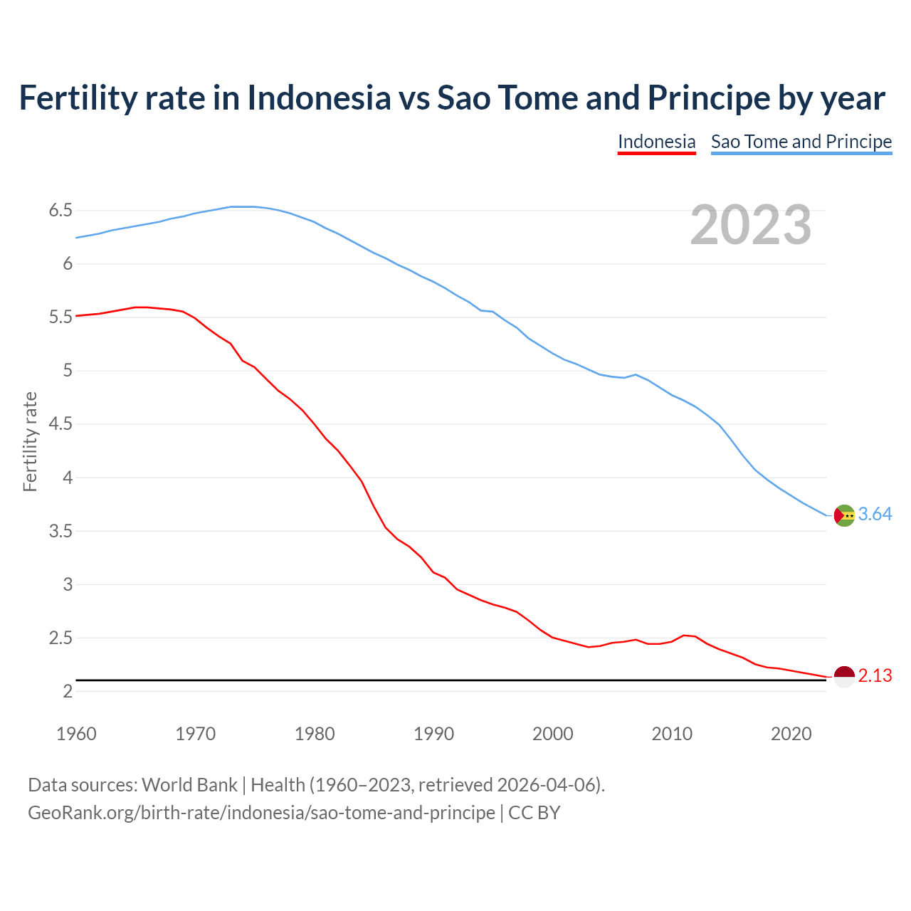 1960 vs 2023, the fertility rate has decreased by 61.4% in Indonesia and by 41.6% in Sao Tome and Principe — in 1960, it was 5.51 and 6.24, respectively.