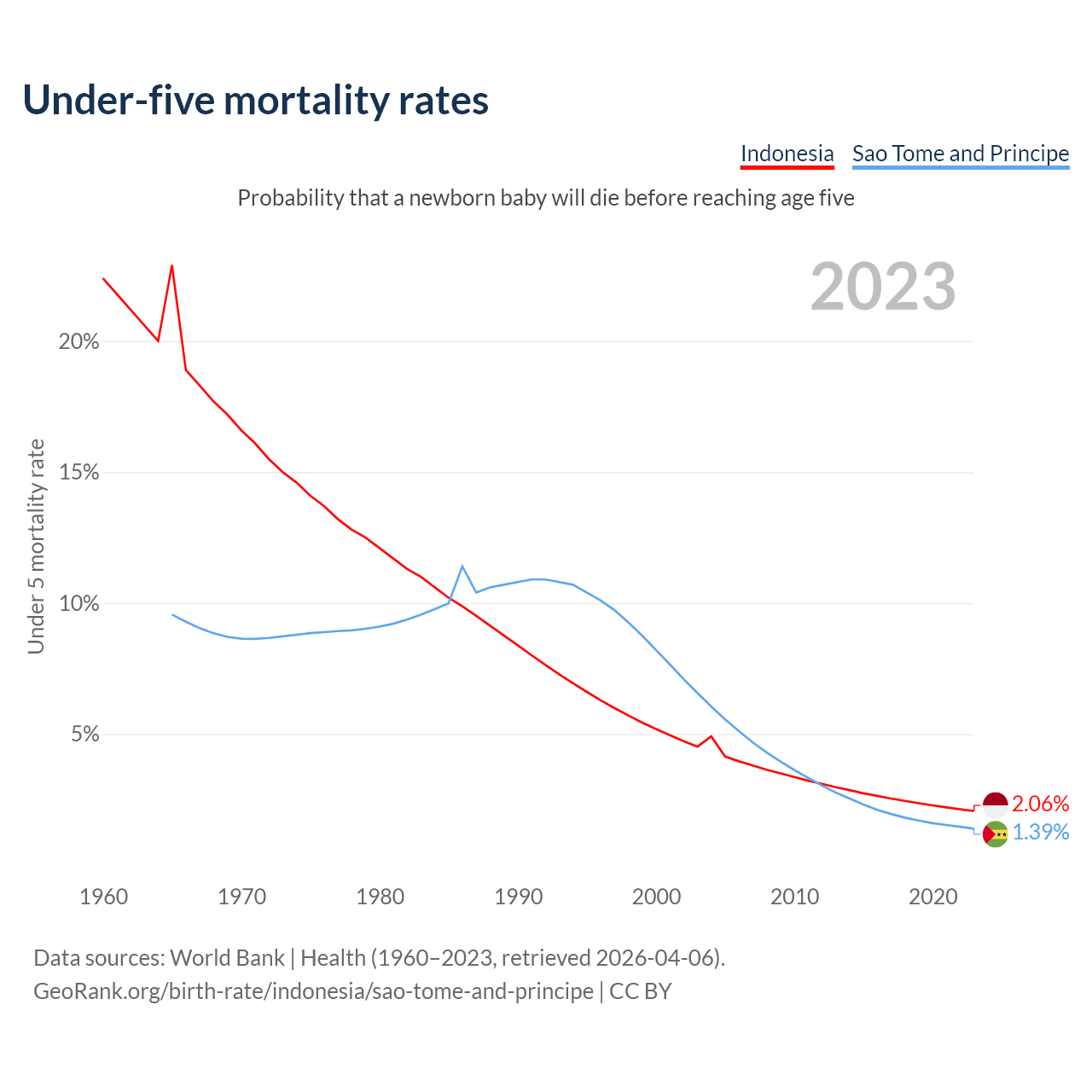 The chance that a newborn baby will die before reaching age five is 2.06% in Indonesia and 1.39% in Sao Tome and Principe. Above is a chart with historical data on under-five mortality rates.