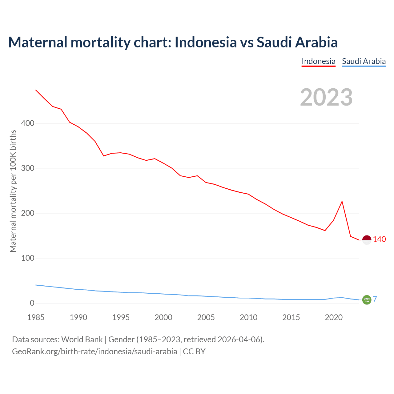 The maternal mortality rate, which is the probability of dying during childbirth or within 42 days of pregnancy termination, is 140 deaths per 100,000 live births in Indonesia, compared to 7 deaths in Saudi Arabia.