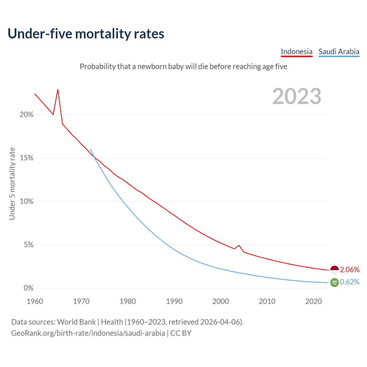 The chance that a newborn baby will die before reaching age five is 2.06% in Indonesia and 0.62% in Saudi Arabia. Above is a chart with historical data on under-five mortality rates.