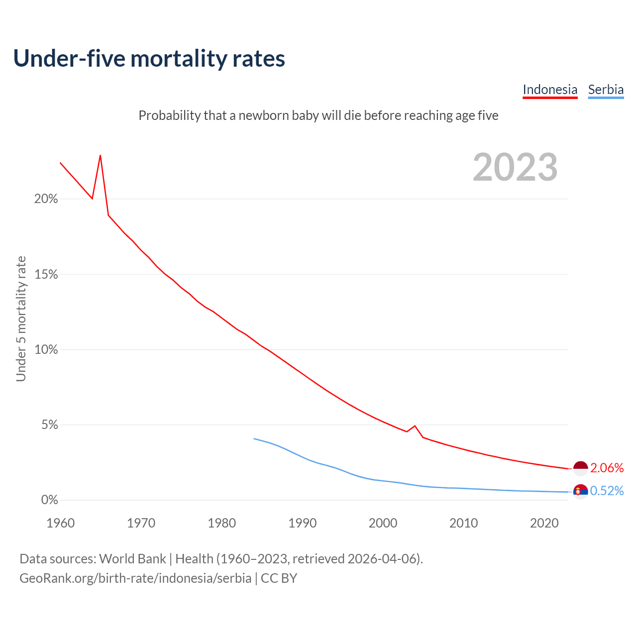 The chance that a newborn baby will die before reaching age five is 2.06% in Indonesia and 0.52% in Serbia. Above is a chart with historical data on under-five mortality rates.